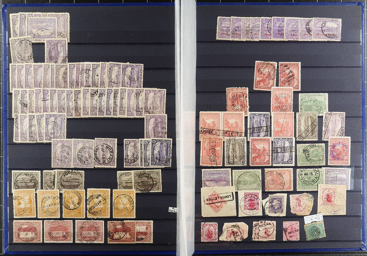 Comprehensive collection of used Tasmania collected for town postmarks, 1857-1912, containing roughly 750 stamps neatly arranged in a stockbook. The collection appears to range from Scott #9/81, including a small selection of early issues. The collection has a nice selection of postmark types including cds, duplex, numeral, along with manuscript and a few other types, noting several 'sock on the nose' town cancels. A lovely collection for the Australia or Commonwealth town postmark collector. Estimate =
