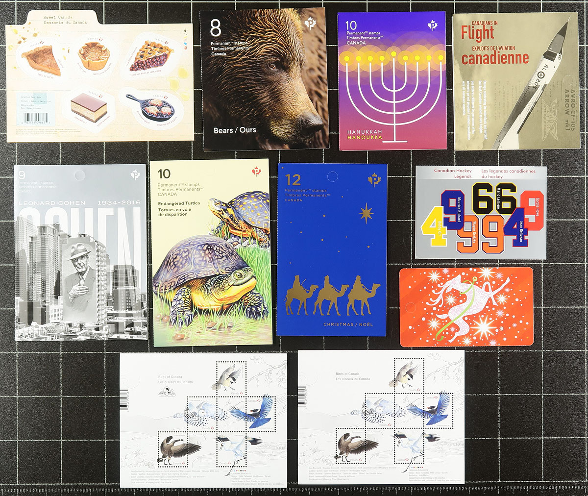 Modern Mint Medley of Post Office sealed packs, complete booklets and souvenir sheet. All are "P" stamp values. Includes the P.O. packs for Armistice, Canadians in Flight (2), Leonard Cohen, Apollo 11 and Bears. Tough to find material. Conservatively valued for the total postage value only. Total face value =