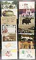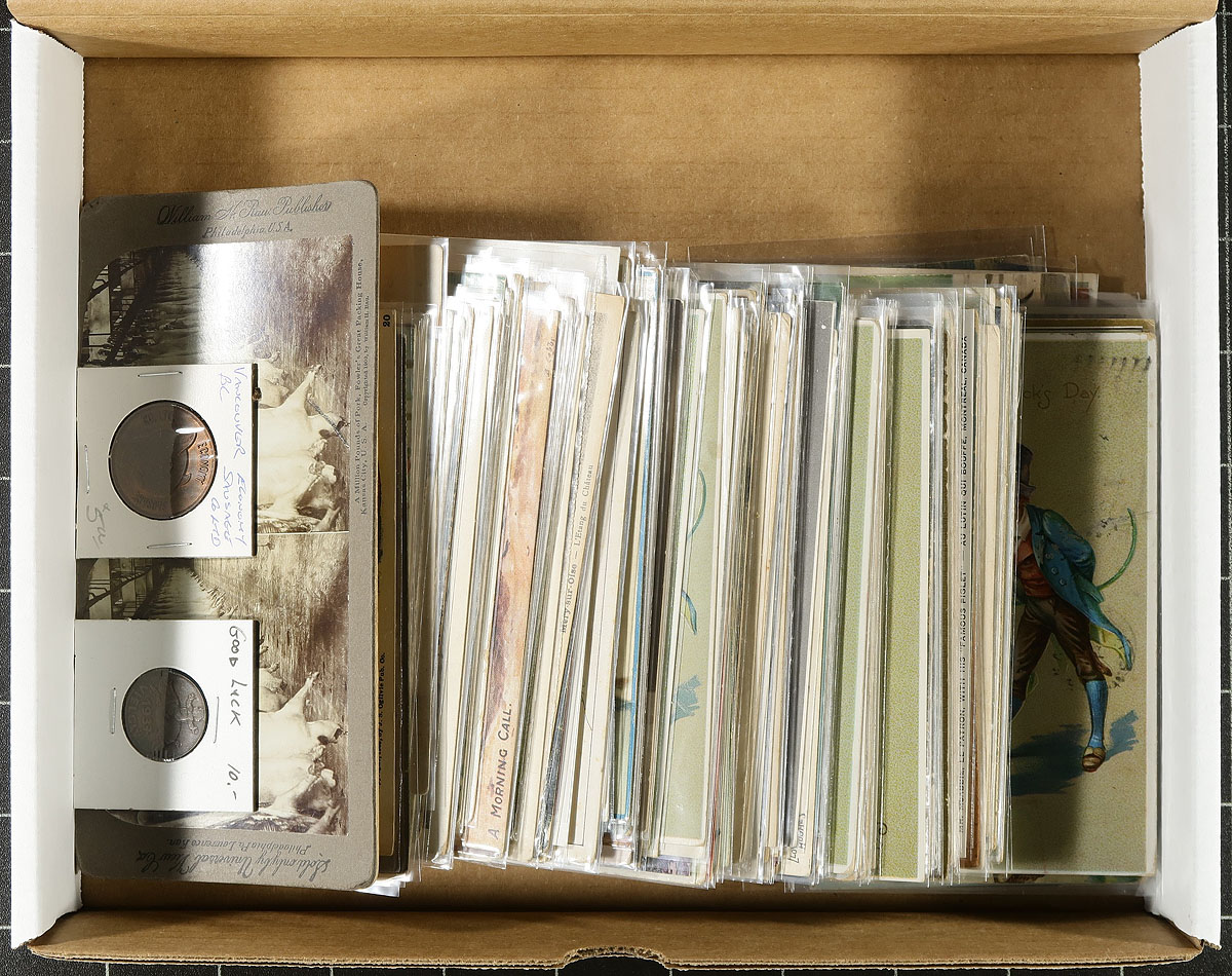 Stunning (and somewhat humorous) collection of "Pigs" on postcards. A total of 140 postcards, ranging from Farm Scenes to Greetings, with the pigs either being the feature of the postcard, or cleverly hiding somewhere in the view (like small piglets crawling over a clover-leaf on a St.Patricks Day greeting). The vast majority appear to be pre-1920, and also includes a few stereo-views and a couple tokens featuring pigs. Near impossible to duplicate. Many years went into making this selection, which we hope you will go hog-wild over. Estimate =