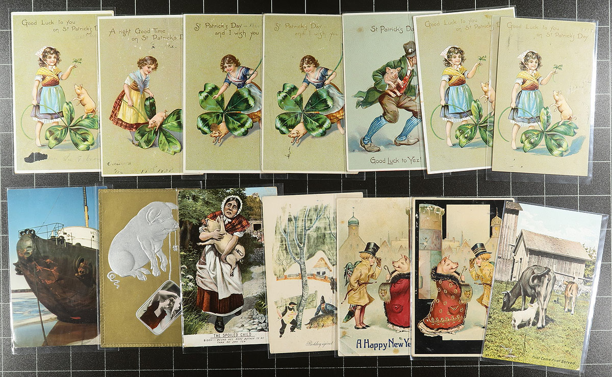 Stunning (and somewhat humorous) collection of "Pigs" on postcards. A total of 140 postcards, ranging from Farm Scenes to Greetings, with the pigs either being the feature of the postcard, or cleverly hiding somewhere in the view (like small piglets crawling over a clover-leaf on a St.Patricks Day greeting). The vast majority appear to be pre-1920, and also includes a few stereo-views and a couple tokens featuring pigs. Near impossible to duplicate. Many years went into making this selection, which we hope you will go hog-wild over. Estimate =