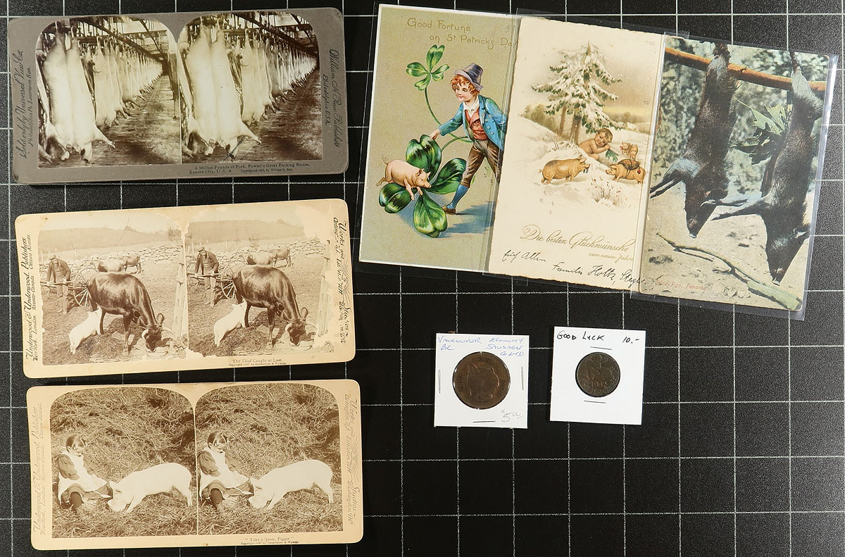 Stunning (and somewhat humorous) collection of "Pigs" on postcards. A total of 140 postcards, ranging from Farm Scenes to Greetings, with the pigs either being the feature of the postcard, or cleverly hiding somewhere in the view (like small piglets crawling over a clover-leaf on a St.Patricks Day greeting). The vast majority appear to be pre-1920, and also includes a few stereo-views and a couple tokens featuring pigs. Near impossible to duplicate. Many years went into making this selection, which we hope you will go hog-wild over. Estimate =