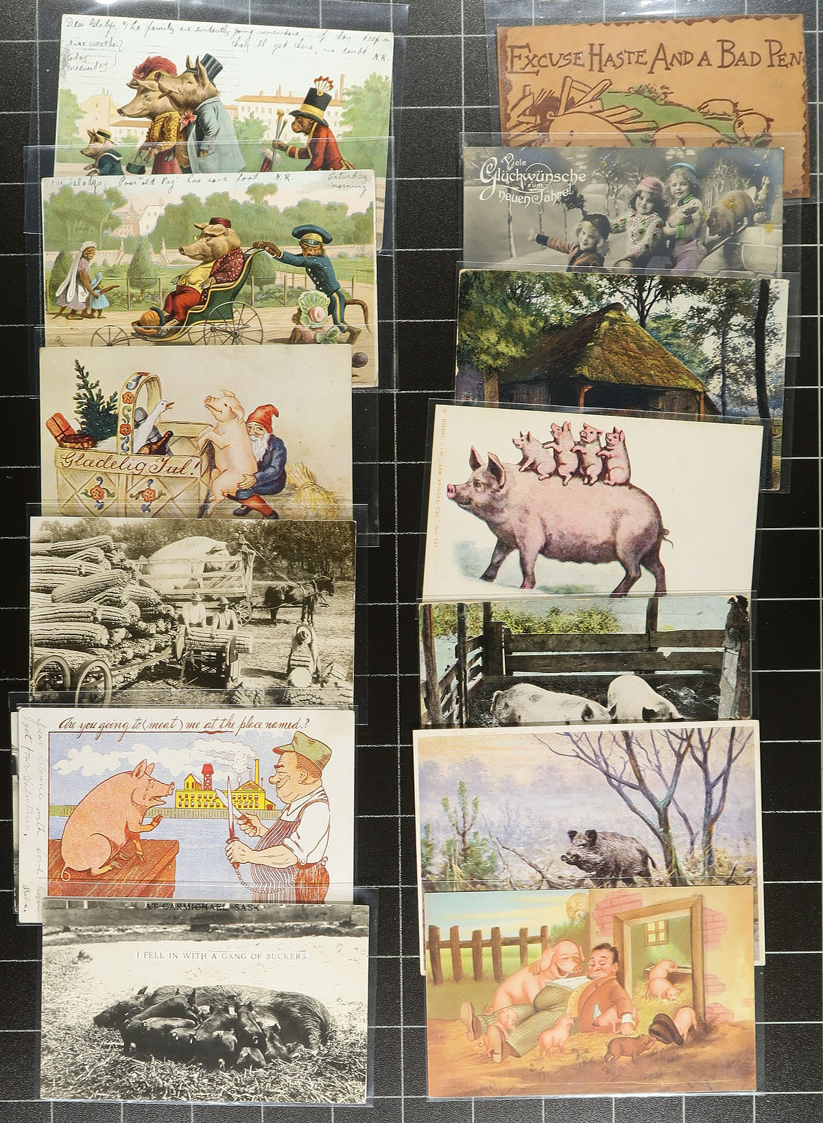 Stunning (and somewhat humorous) collection of "Pigs" on postcards. A total of 140 postcards, ranging from Farm Scenes to Greetings, with the pigs either being the feature of the postcard, or cleverly hiding somewhere in the view (like small piglets crawling over a clover-leaf on a St.Patricks Day greeting). The vast majority appear to be pre-1920, and also includes a few stereo-views and a couple tokens featuring pigs. Near impossible to duplicate. Many years went into making this selection, which we hope you will go hog-wild over. Estimate =