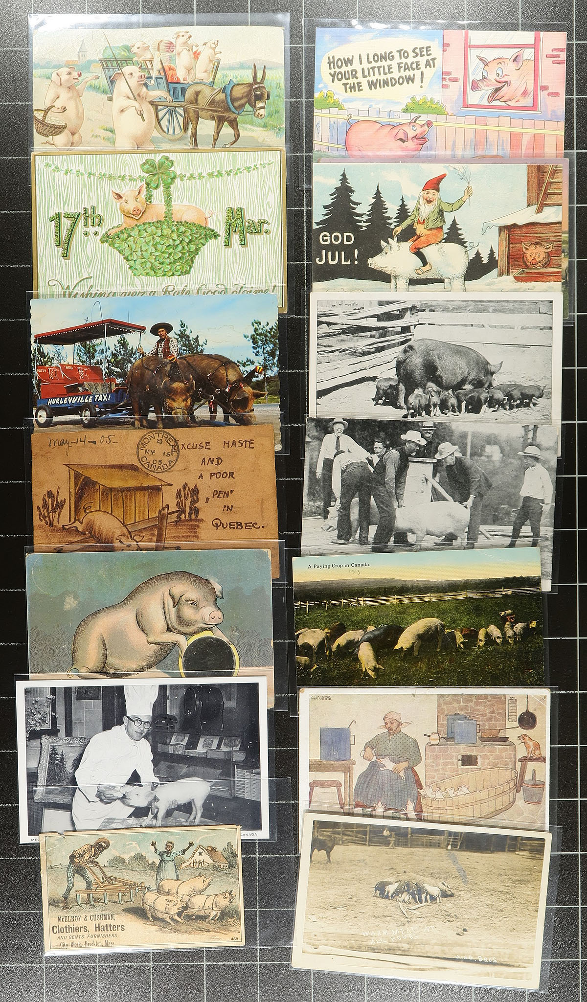 Stunning (and somewhat humorous) collection of "Pigs" on postcards. A total of 140 postcards, ranging from Farm Scenes to Greetings, with the pigs either being the feature of the postcard, or cleverly hiding somewhere in the view (like small piglets crawling over a clover-leaf on a St.Patricks Day greeting). The vast majority appear to be pre-1920, and also includes a few stereo-views and a couple tokens featuring pigs. Near impossible to duplicate. Many years went into making this selection, which we hope you will go hog-wild over. Estimate =