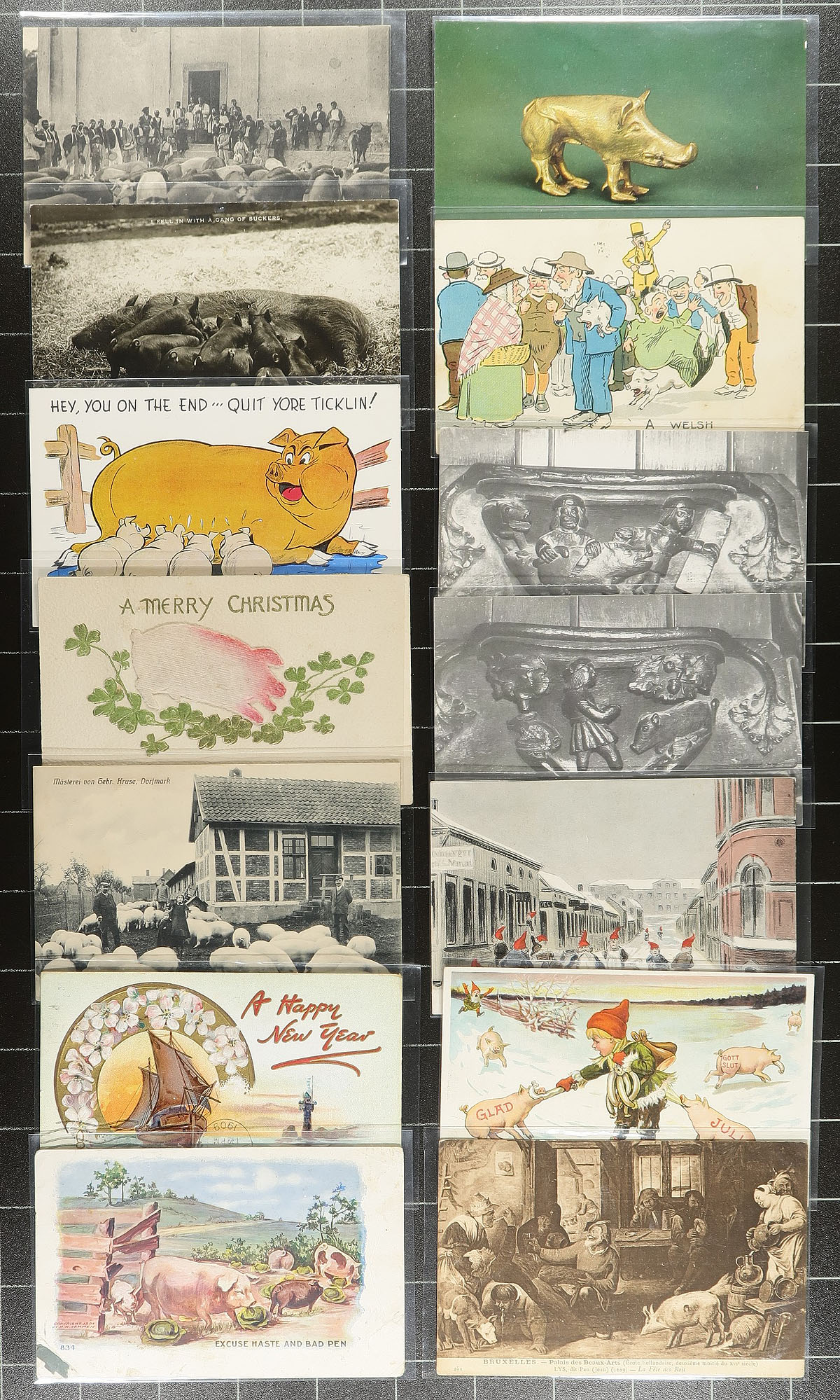 Stunning (and somewhat humorous) collection of "Pigs" on postcards. A total of 140 postcards, ranging from Farm Scenes to Greetings, with the pigs either being the feature of the postcard, or cleverly hiding somewhere in the view (like small piglets crawling over a clover-leaf on a St.Patricks Day greeting). The vast majority appear to be pre-1920, and also includes a few stereo-views and a couple tokens featuring pigs. Near impossible to duplicate. Many years went into making this selection, which we hope you will go hog-wild over. Estimate =