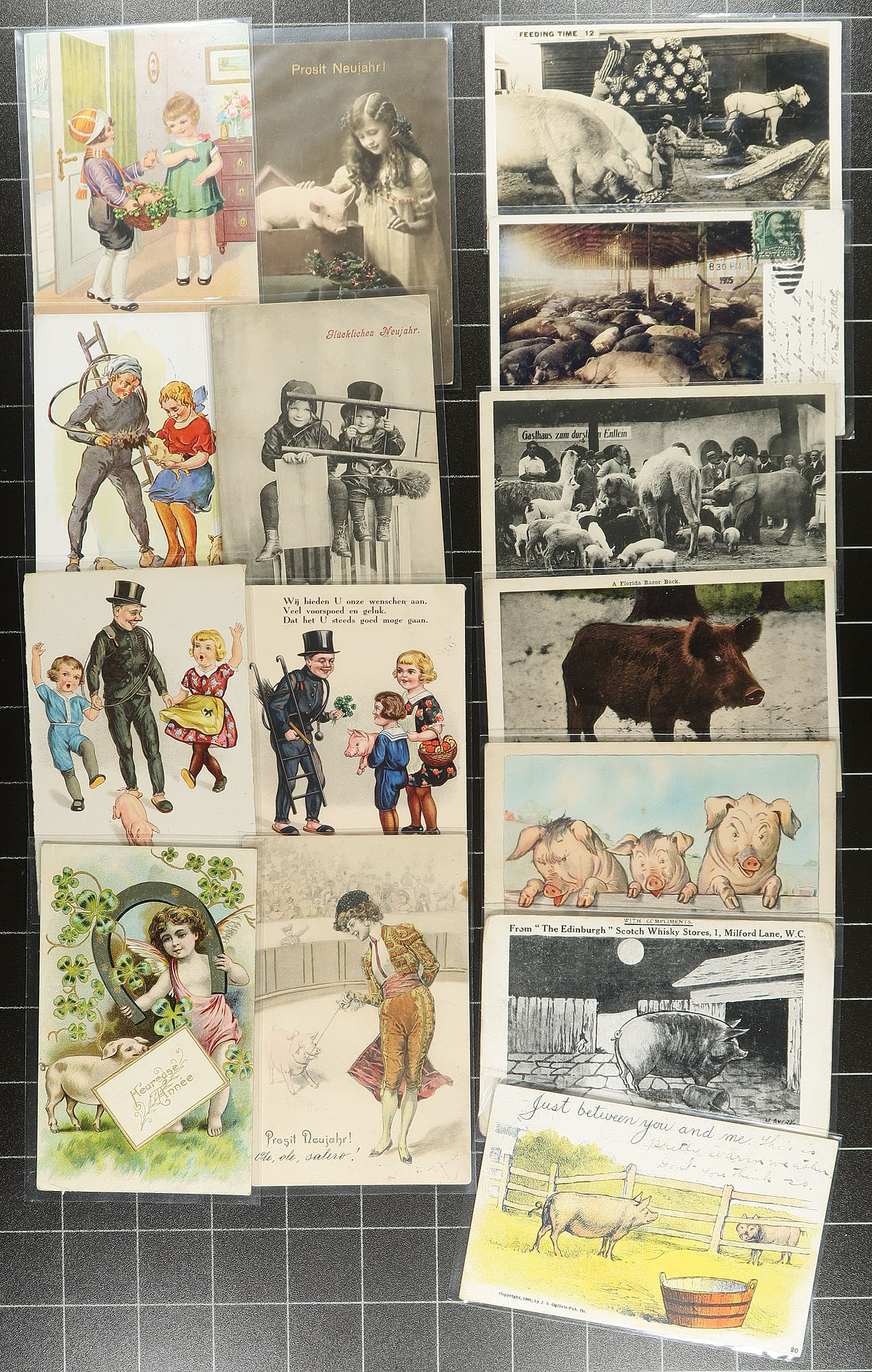 Stunning (and somewhat humorous) collection of "Pigs" on postcards. A total of 140 postcards, ranging from Farm Scenes to Greetings, with the pigs either being the feature of the postcard, or cleverly hiding somewhere in the view (like small piglets crawling over a clover-leaf on a St.Patricks Day greeting). The vast majority appear to be pre-1920, and also includes a few stereo-views and a couple tokens featuring pigs. Near impossible to duplicate. Many years went into making this selection, which we hope you will go hog-wild over. Estimate =
