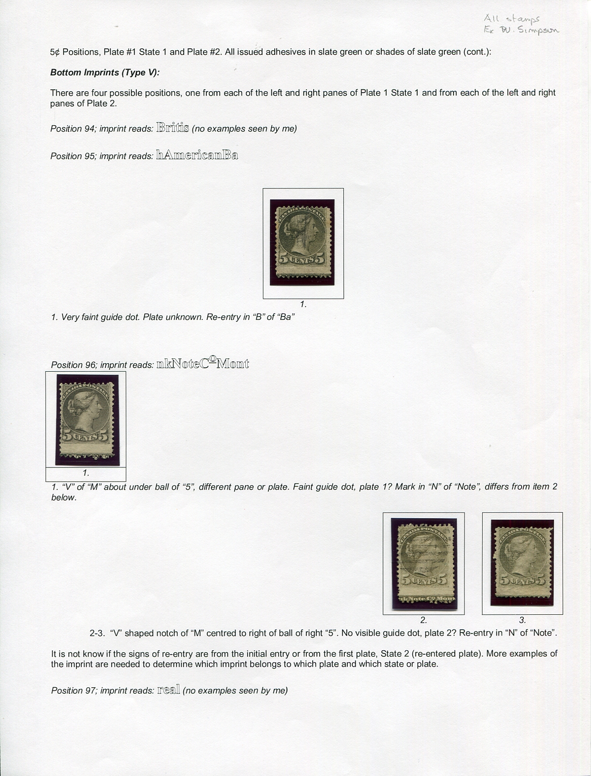 Advanced study of the 5c Small Queen Plate Imprints, with 4 used stamps, plus an unused (no gum) 5th example. All extensively written-up in an article format (we have scanned the entire group, just be aware the actual stamps are in block mounts, the rest are copies for the article, 5 stamps in total). Estimate =