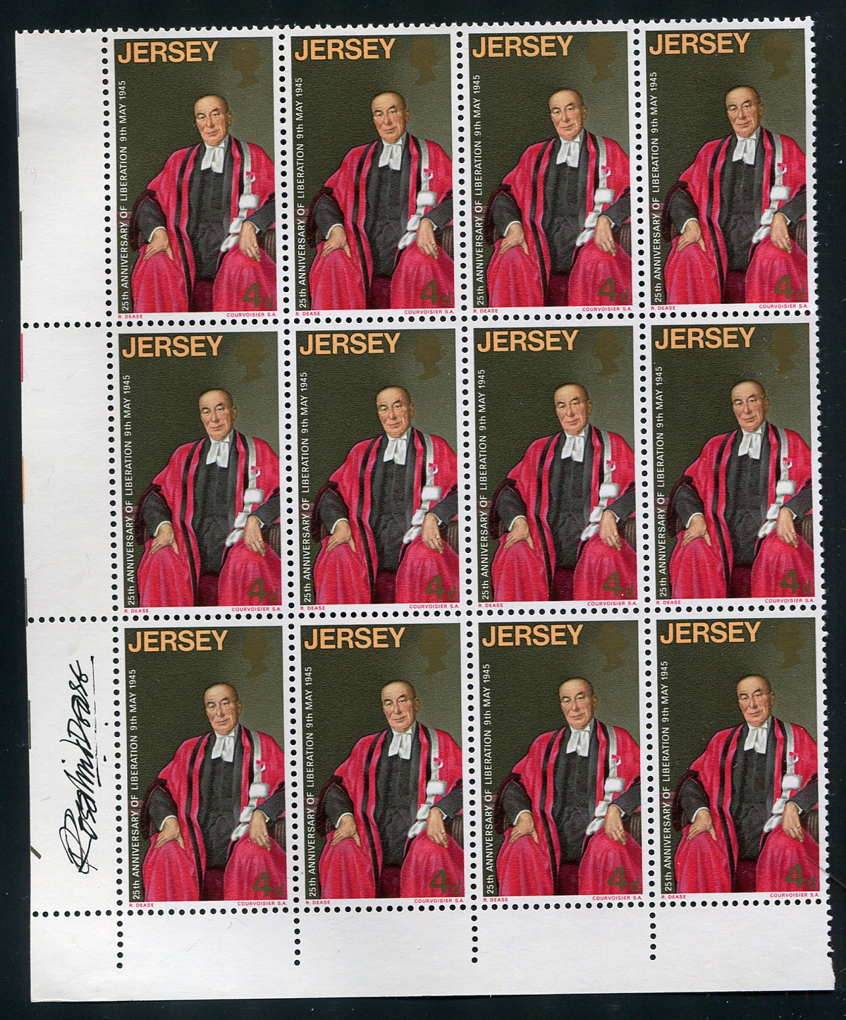 VF mint Never Hinged corner blocks of 12 of the 4p to 1sh9p "Anniversary of Jersey's Liberation from the Germans" series, with each block signed by the artist Rosalind Dease in the margin. Interesting plus-value additions to any collection. Estimate =