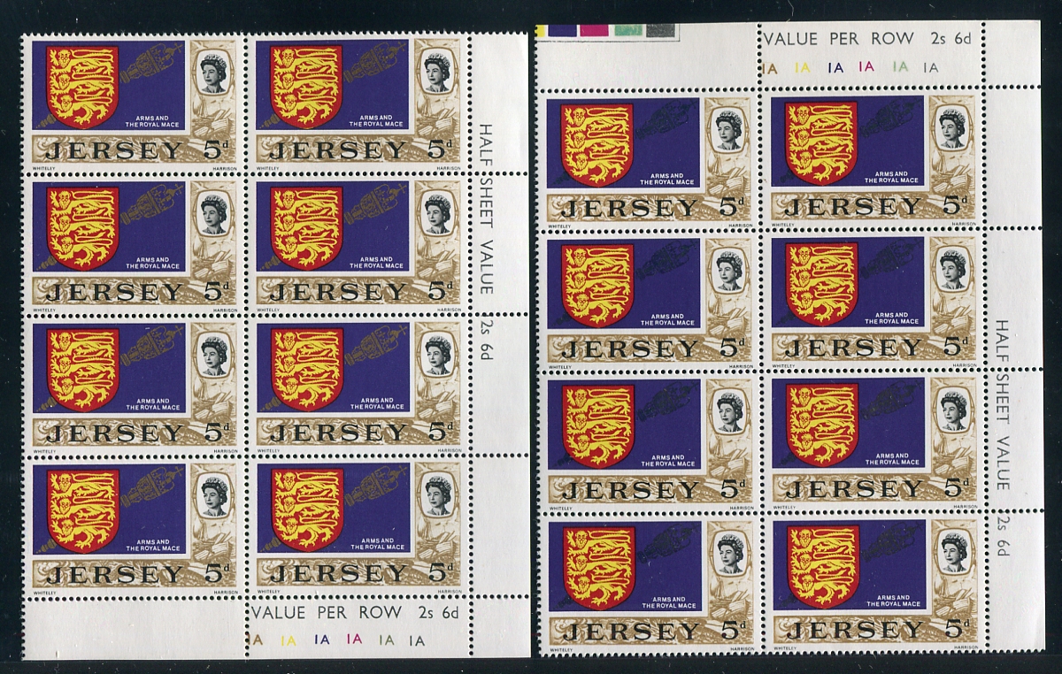 VF mint Never Hinged upper-right cylinder block of 8, with a progressive printing of the gold mace (applied so lightly, it is hard to see), accompanied by a normal lower right corner block of the stamp to show how dramatic this error is. Stanley Gibbons lists the booklet stamp with "missing mace" at £500.00 per stamp. While this is clearly not from the booklet, it is about as close to "missing mace" as you will find on a regular sheet printing. Quite striking in-hand. Estimate =