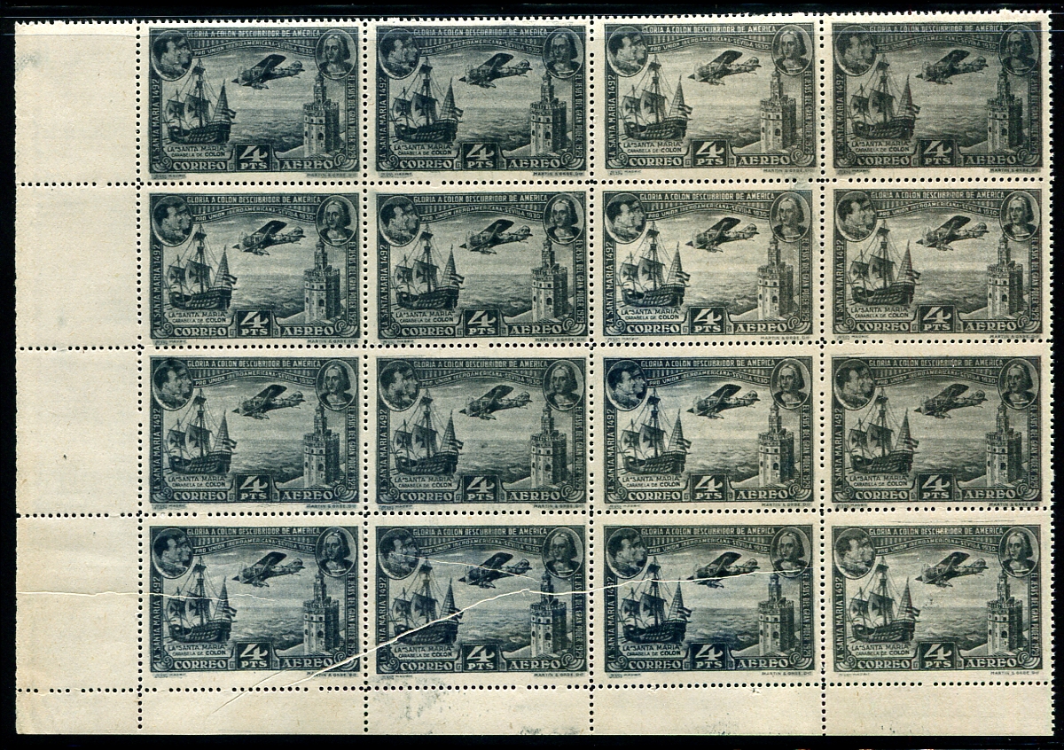 VF mint Never Hinged corner block of 16 of the 4p slate blue 1930 airmail issue, with attractive pre-printing paper fold, affecting the bottom left 3 stamps. A striking printing variety. As regular stamps (not considering the error), this block catalogues US$480.00 ($648.00 CDN). Estimate =