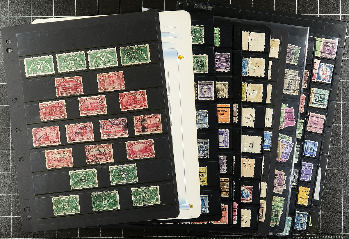 Parcel Post, Precancels and Perfins. An intriguing collector's assembly of these three collecting areas, assembled on 10 stocksheets (several double sided). Noted several better stamps in both the precancels and perfins (i.e, $1.00 Washington precancel), and a diverse range of issues (regular issues, postage due, coils, special delivery, airmail etc). Take a good look at the scans on this one, as while there many be the odd small fault, there are likely also some treasures lurking for the keen eye. Over 1,400 stamps in total. Estimate =