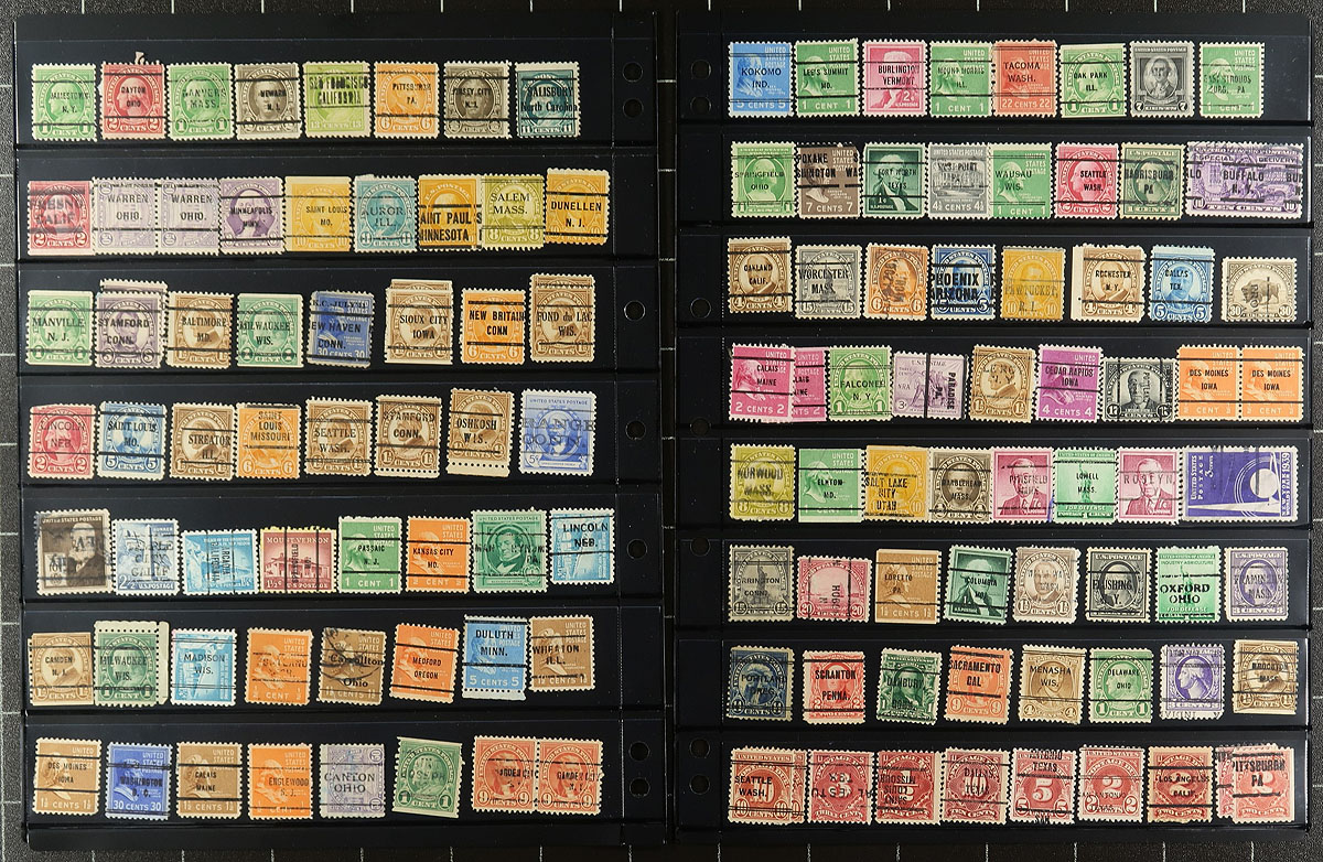 Parcel Post, Precancels and Perfins. An intriguing collector's assembly of these three collecting areas, assembled on 10 stocksheets (several double sided). Noted several better stamps in both the precancels and perfins (i.e, $1.00 Washington precancel), and a diverse range of issues (regular issues, postage due, coils, special delivery, airmail etc). Take a good look at the scans on this one, as while there many be the odd small fault, there are likely also some treasures lurking for the keen eye. Over 1,400 stamps in total. Estimate =