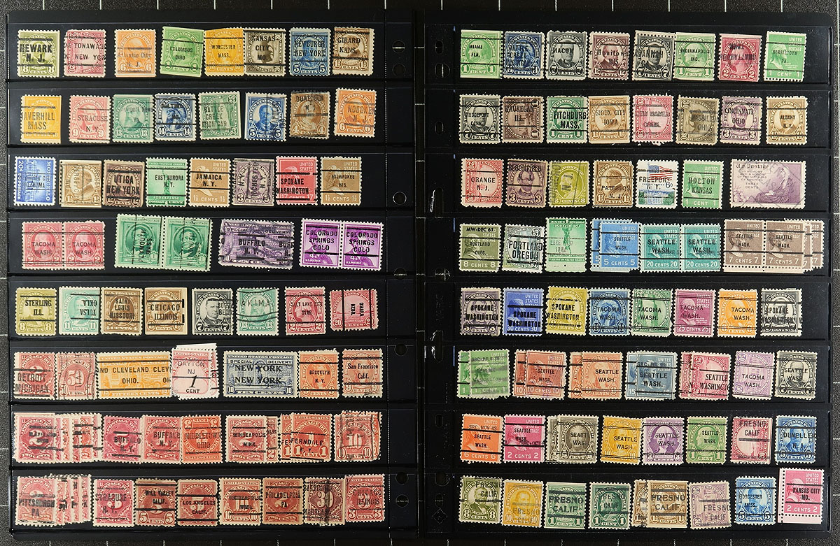Parcel Post, Precancels and Perfins. An intriguing collector's assembly of these three collecting areas, assembled on 10 stocksheets (several double sided). Noted several better stamps in both the precancels and perfins (i.e, $1.00 Washington precancel), and a diverse range of issues (regular issues, postage due, coils, special delivery, airmail etc). Take a good look at the scans on this one, as while there many be the odd small fault, there are likely also some treasures lurking for the keen eye. Over 1,400 stamps in total. Estimate =