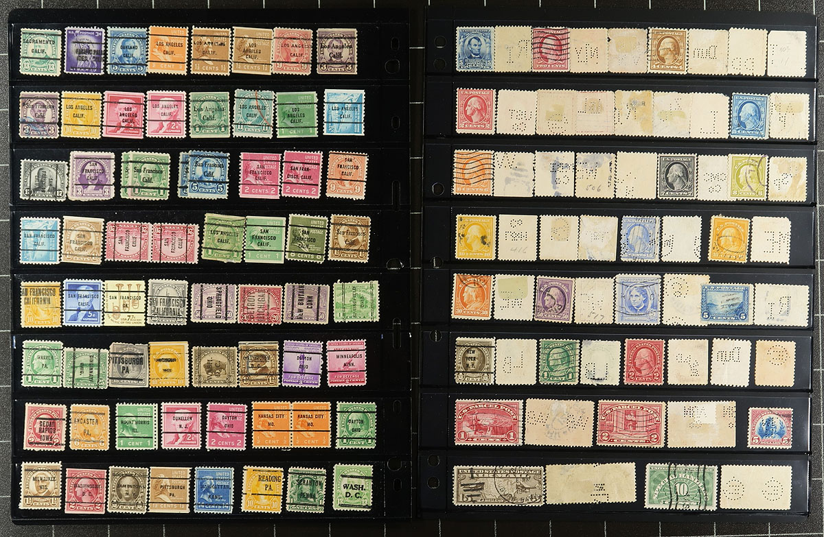 Parcel Post, Precancels and Perfins. An intriguing collector's assembly of these three collecting areas, assembled on 10 stocksheets (several double sided). Noted several better stamps in both the precancels and perfins (i.e, $1.00 Washington precancel), and a diverse range of issues (regular issues, postage due, coils, special delivery, airmail etc). Take a good look at the scans on this one, as while there many be the odd small fault, there are likely also some treasures lurking for the keen eye. Over 1,400 stamps in total. Estimate =