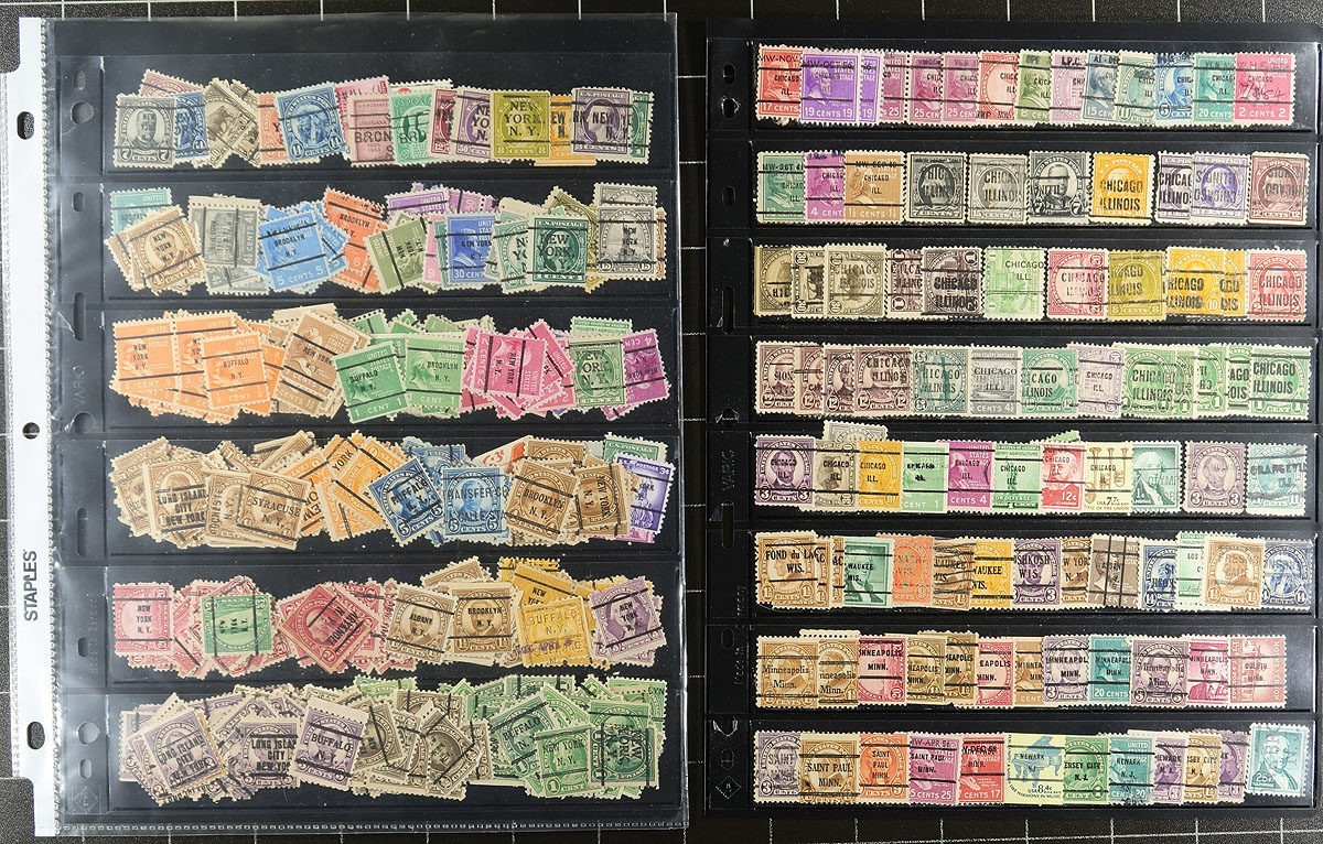 Parcel Post, Precancels and Perfins. An intriguing collector's assembly of these three collecting areas, assembled on 10 stocksheets (several double sided). Noted several better stamps in both the precancels and perfins (i.e, $1.00 Washington precancel), and a diverse range of issues (regular issues, postage due, coils, special delivery, airmail etc). Take a good look at the scans on this one, as while there many be the odd small fault, there are likely also some treasures lurking for the keen eye. Over 1,400 stamps in total. Estimate =