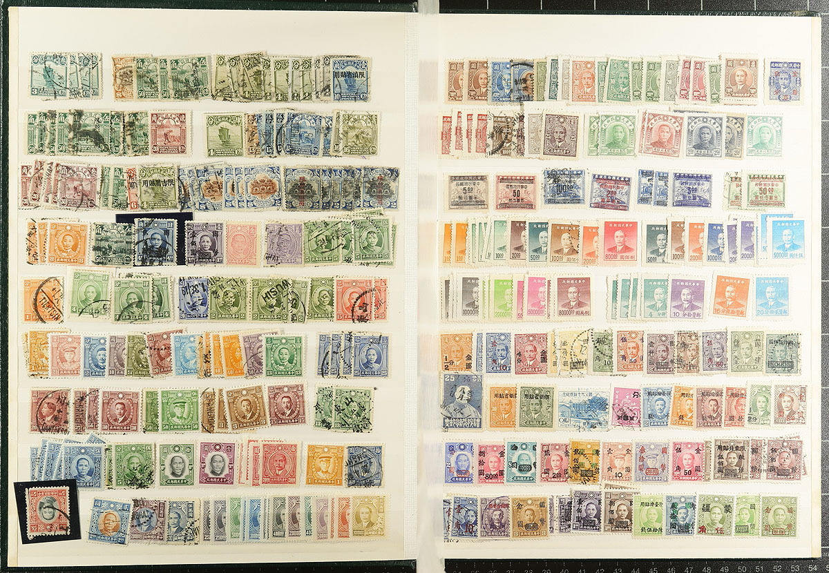 Old-time collectors stash of China / PRC China and ROC China, mint and used, assembled in a 16-page stockbook. Lots of better items noted, including postmarks. Totally unchecked for better overprints, reprints etc. Truly offered as-received. An excellent opportunity for study of these often complicated issues. Estimate =