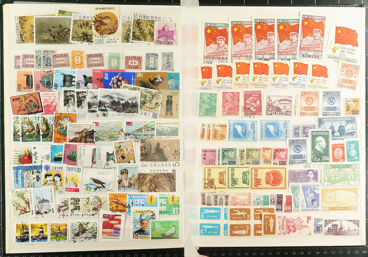 Old-time collectors stash of China / PRC China and ROC China, mint and used, assembled in a 16-page stockbook. Lots of better items noted, including postmarks. Totally unchecked for better overprints, reprints etc. Truly offered as-received. An excellent opportunity for study of these often complicated issues. Estimate =