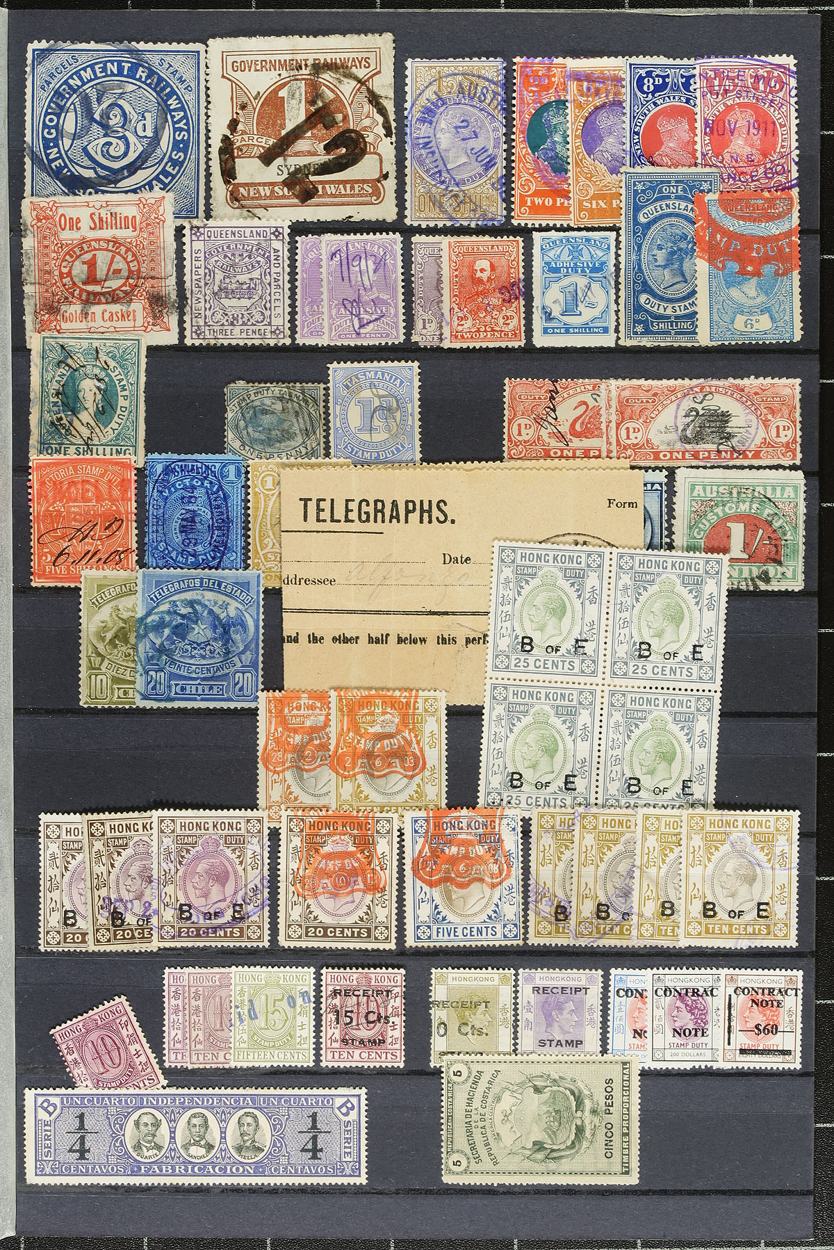 A wild-ride of Worldwide Revenues / Postal Fiscal stamps, with four stockpages as received. Noted Canada, Isle of Man, UK, Hong Kong, Australia and states, India, Southern Rhodesia, Ceylon and non-commonwealth. Fascinating material, in need of further research. Estimate =