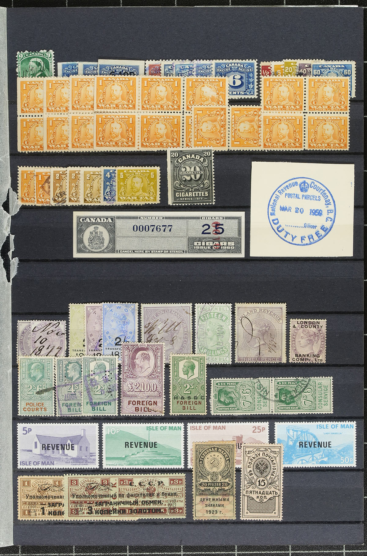 A wild-ride of Worldwide Revenues / Postal Fiscal stamps, with four stockpages as received. Noted Canada, Isle of Man, UK, Hong Kong, Australia and states, India, Southern Rhodesia, Ceylon and non-commonwealth. Fascinating material, in need of further research. Estimate =