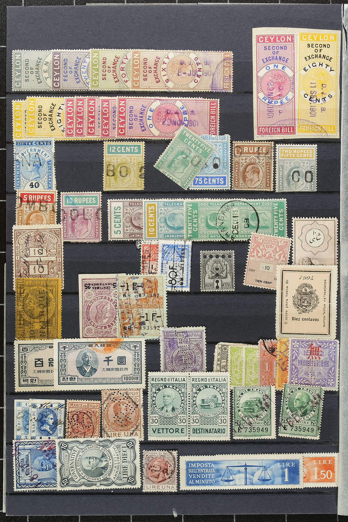 A wild-ride of Worldwide Revenues / Postal Fiscal stamps, with four stockpages as received. Noted Canada, Isle of Man, UK, Hong Kong, Australia and states, India, Southern Rhodesia, Ceylon and non-commonwealth. Fascinating material, in need of further research. Estimate =