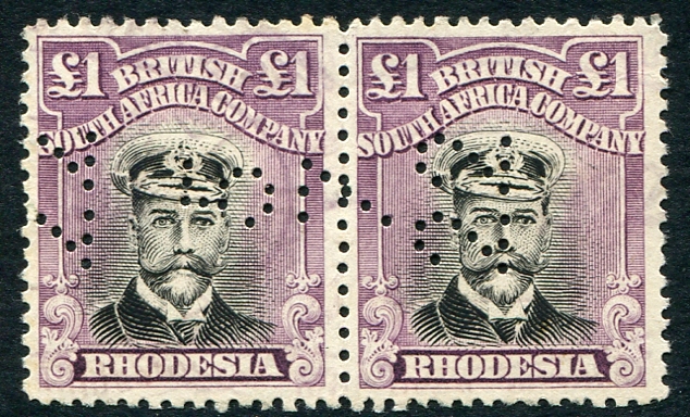 F/VF fiscally-used (perfin/punch cancel) pair of the £1.00 high-value George V Rhodesian Admiral (Die III, perf 14). Scott list the Die III version of this stamp as "magenta and black", with a catalogue value of US$2500.00 for the pair. Gibbons goes into more detail on Die III, listing shades of "bright purple, deep purple, deep violet and violet-indigo" (at £700-£800 per stamp). The owner has conservatively catalogued these stamps at 10% of value for fiscal use, making this an excellent opportunity to complete the Rhodesian Admirals in your collection at a fraction of the catalogue value. Estimated catalogue value US$250.00 =