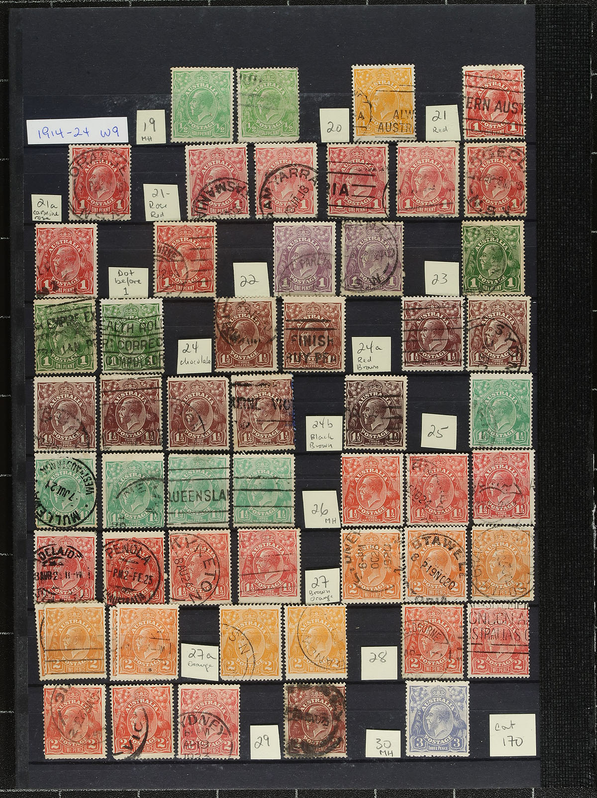 Comprehensive used collection of Australian "Kangaroos" and George V "Heads", all organized and numbered per Scott catalogue, covering the period if 1913 to 1931. Many sub-numbers are included for die, shade and/or watermark varieties. A fair number of duplicated are included, which opens up further room for specialized study and postmark interest. We noted a few mint hinged, including #5 (cat US$140.00) and #9 (cat US$140.00), but most are used. While a few small faults are to be expected, a close inspection of the scans will reveal many nice copies and overall condition well above average. A great introduction to this classic era of Australian stamps, ready for a more serious development and specialization. A total of 247 stamps. Owner's 2021 Scott US$1,994.00 =