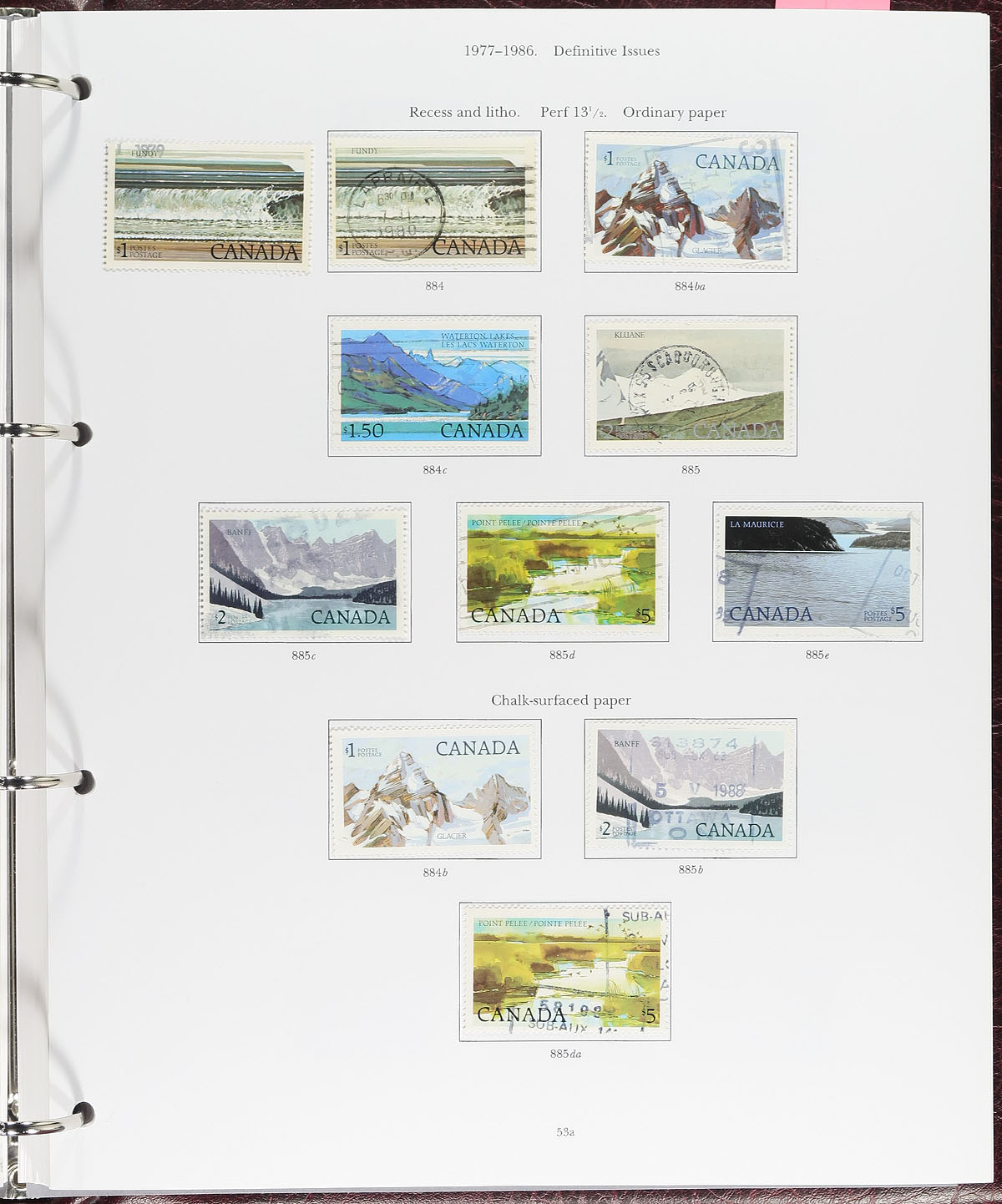 Lovely collection of used Canada in 5 Deluxe padded Stanley Gibbons 4-ring binders with original cardboard outer box, 1859-2018. This well organized lot ranges from Scott #14/3134 (collection is on Stanley Gibbons pages with S.G. numbers), and begins with Scott #s 14 (x2, partially dated postmarks), 15, 21-26, 27 (x3), 28 (x2), 29, also includes 24a Bothwell watermark paper (BO), along with a small selection of Small Queens (note 20c and 50c Widow Weeds), short set of Jubilees from 1/2c to 50c, and continues with mostly partial sets and a few complete sets of Numerals, Scrolls, War, and Peace issues, noting some stamps cataloguing $10 to $20 and up. The collection continues with singles, blocks, souvenir sheets, along with an attempt to reconstruct panes and souvenir sheets, and is fairly complete up to 2005, with sporadically filled pages up to 2018. A wonderful opportunity to continue this collection in high quality albums which originally retailed in the many hundreds of dollars. Our online photos show a sampling. Estimate =