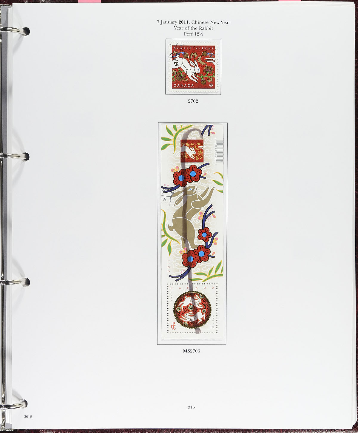 Lovely collection of used Canada in 5 Deluxe padded Stanley Gibbons 4-ring binders with original cardboard outer box, 1859-2018. This well organized lot ranges from Scott #14/3134 (collection is on Stanley Gibbons pages with S.G. numbers), and begins with Scott #s 14 (x2, partially dated postmarks), 15, 21-26, 27 (x3), 28 (x2), 29, also includes 24a Bothwell watermark paper (BO), along with a small selection of Small Queens (note 20c and 50c Widow Weeds), short set of Jubilees from 1/2c to 50c, and continues with mostly partial sets and a few complete sets of Numerals, Scrolls, War, and Peace issues, noting some stamps cataloguing $10 to $20 and up. The collection continues with singles, blocks, souvenir sheets, along with an attempt to reconstruct panes and souvenir sheets, and is fairly complete up to 2005, with sporadically filled pages up to 2018. A wonderful opportunity to continue this collection in high quality albums which originally retailed in the many hundreds of dollars. Our online photos show a sampling. Estimate =