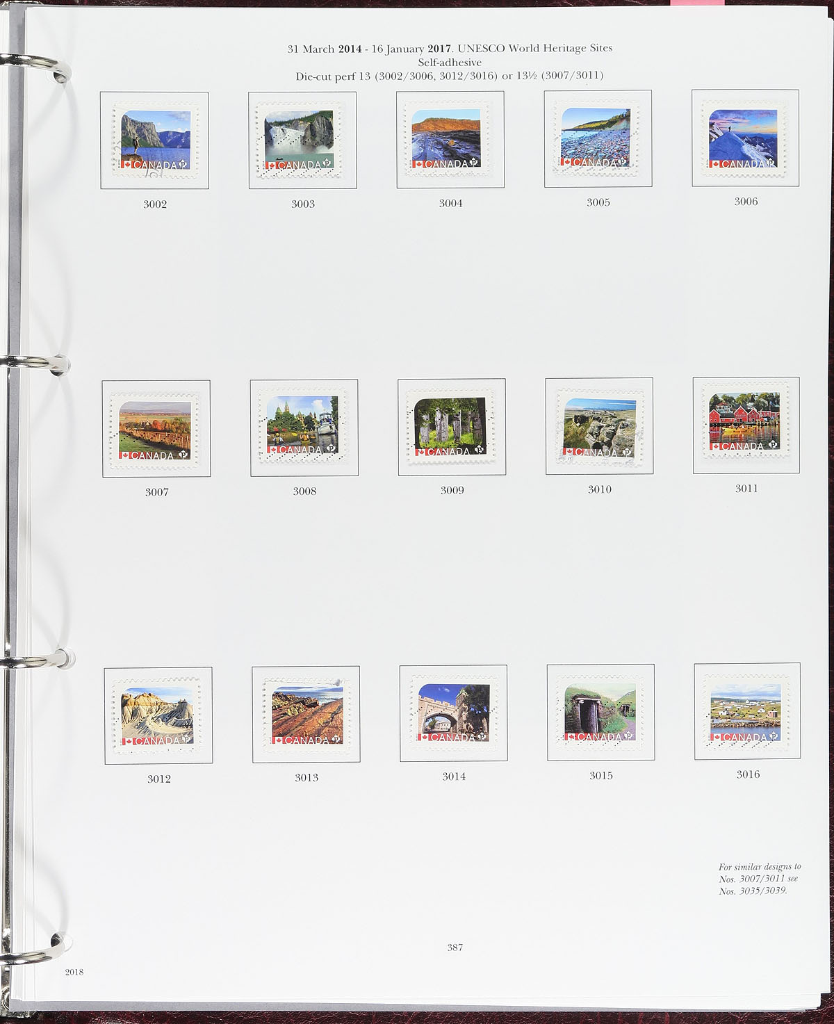 Lovely collection of used Canada in 5 Deluxe padded Stanley Gibbons 4-ring binders with original cardboard outer box, 1859-2018. This well organized lot ranges from Scott #14/3134 (collection is on Stanley Gibbons pages with S.G. numbers), and begins with Scott #s 14 (x2, partially dated postmarks), 15, 21-26, 27 (x3), 28 (x2), 29, also includes 24a Bothwell watermark paper (BO), along with a small selection of Small Queens (note 20c and 50c Widow Weeds), short set of Jubilees from 1/2c to 50c, and continues with mostly partial sets and a few complete sets of Numerals, Scrolls, War, and Peace issues, noting some stamps cataloguing $10 to $20 and up. The collection continues with singles, blocks, souvenir sheets, along with an attempt to reconstruct panes and souvenir sheets, and is fairly complete up to 2005, with sporadically filled pages up to 2018. A wonderful opportunity to continue this collection in high quality albums which originally retailed in the many hundreds of dollars. Our online photos show a sampling. Estimate =