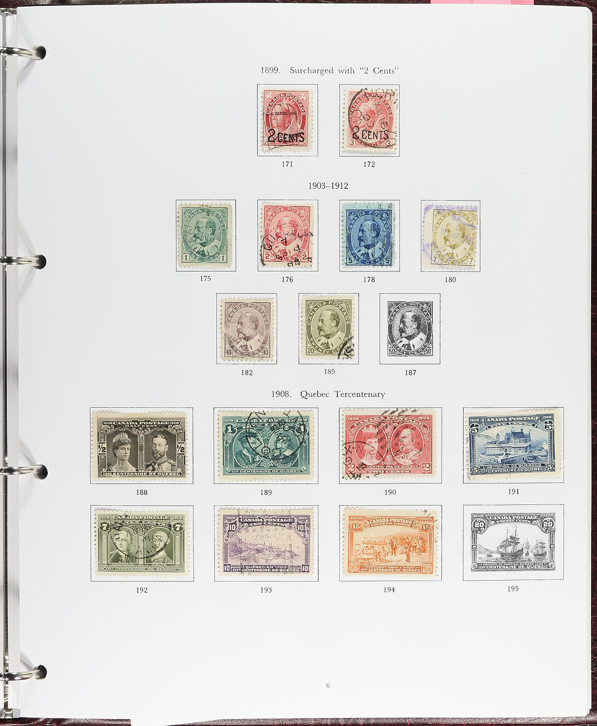 Lovely collection of used Canada in 5 Deluxe padded Stanley Gibbons 4-ring binders with original cardboard outer box, 1859-2018. This well organized lot ranges from Scott #14/3134 (collection is on Stanley Gibbons pages with S.G. numbers), and begins with Scott #s 14 (x2, partially dated postmarks), 15, 21-26, 27 (x3), 28 (x2), 29, also includes 24a Bothwell watermark paper (BO), along with a small selection of Small Queens (note 20c and 50c Widow Weeds), short set of Jubilees from 1/2c to 50c, and continues with mostly partial sets and a few complete sets of Numerals, Scrolls, War, and Peace issues, noting some stamps cataloguing $10 to $20 and up. The collection continues with singles, blocks, souvenir sheets, along with an attempt to reconstruct panes and souvenir sheets, and is fairly complete up to 2005, with sporadically filled pages up to 2018. A wonderful opportunity to continue this collection in high quality albums which originally retailed in the many hundreds of dollars. Our online photos show a sampling. Estimate =