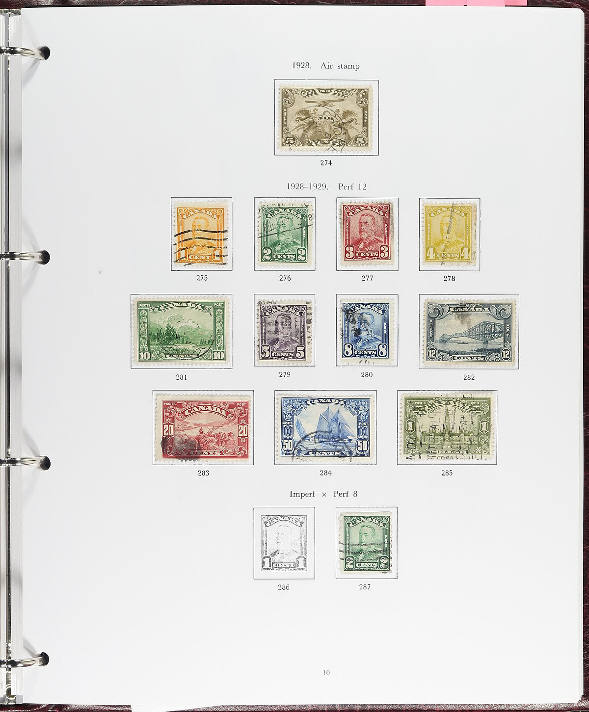 Lovely collection of used Canada in 5 Deluxe padded Stanley Gibbons 4-ring binders with original cardboard outer box, 1859-2018. This well organized lot ranges from Scott #14/3134 (collection is on Stanley Gibbons pages with S.G. numbers), and begins with Scott #s 14 (x2, partially dated postmarks), 15, 21-26, 27 (x3), 28 (x2), 29, also includes 24a Bothwell watermark paper (BO), along with a small selection of Small Queens (note 20c and 50c Widow Weeds), short set of Jubilees from 1/2c to 50c, and continues with mostly partial sets and a few complete sets of Numerals, Scrolls, War, and Peace issues, noting some stamps cataloguing $10 to $20 and up. The collection continues with singles, blocks, souvenir sheets, along with an attempt to reconstruct panes and souvenir sheets, and is fairly complete up to 2005, with sporadically filled pages up to 2018. A wonderful opportunity to continue this collection in high quality albums which originally retailed in the many hundreds of dollars. Our online photos show a sampling. Estimate =