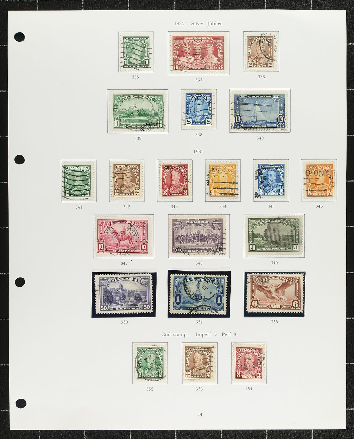Collection of used Canada in a Minkus album, 1859-1979. This fairly well organized collection contains many hundreds of stamps ranging from Scott #14/846, beginning with #s 14-15, a small selection of Large and Small Queens (noting 20c and 50c Widow Weeds), full sets of Numerals, Edwards, Quebecs, Admirals, Scrolls (50c Bluenose (x2)), Arch, Pictorials, up to the Peace issues. The lot also includes a few presentation folders, blocks, and extra album pages. Some faults with a few of the early issues, still a nice starter collection with a few better items within. Estimate =
