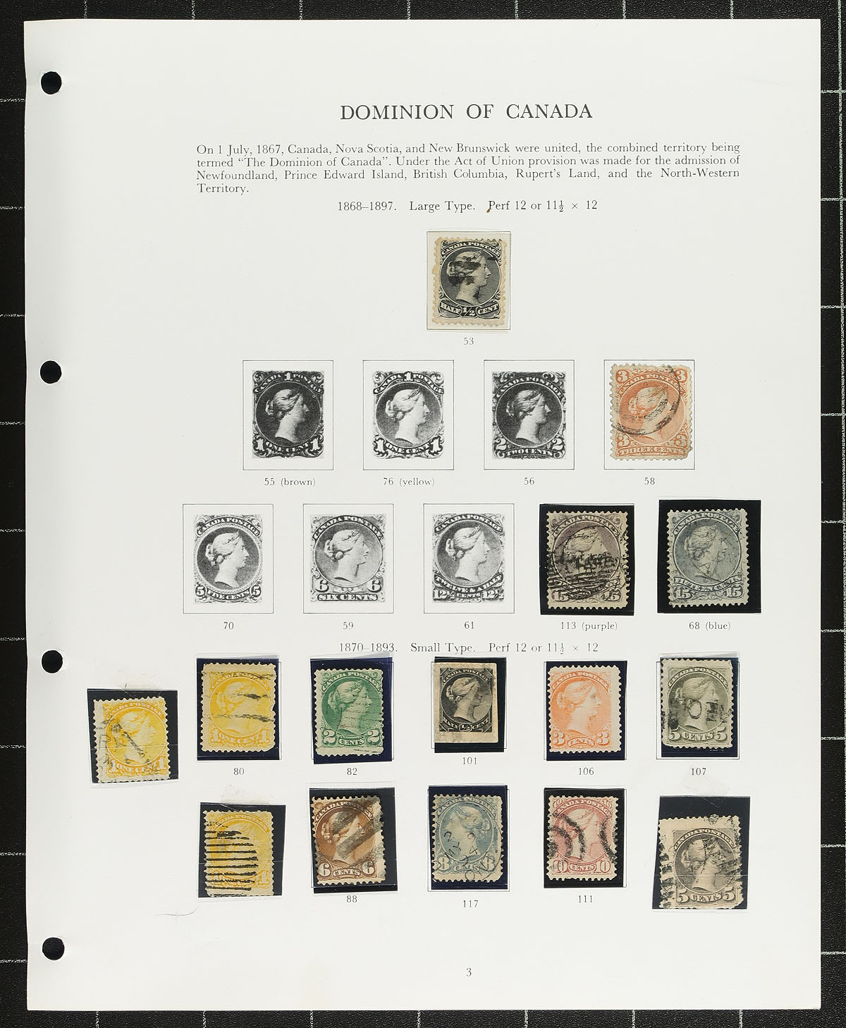 Collection of used Canada in a Minkus album, 1859-1979. This fairly well organized collection contains many hundreds of stamps ranging from Scott #14/846, beginning with #s 14-15, a small selection of Large and Small Queens (noting 20c and 50c Widow Weeds), full sets of Numerals, Edwards, Quebecs, Admirals, Scrolls (50c Bluenose (x2)), Arch, Pictorials, up to the Peace issues. The lot also includes a few presentation folders, blocks, and extra album pages. Some faults with a few of the early issues, still a nice starter collection with a few better items within. Estimate =