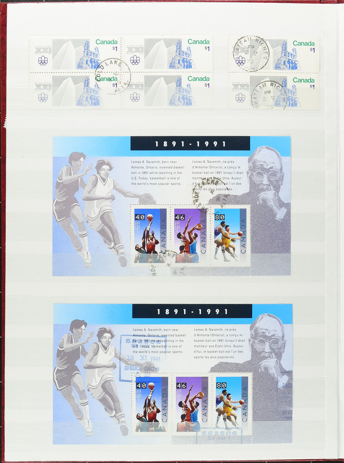 Large accumulation of used Canada, Small Queens to the 2000's. The lot contains roughly 30,000 stamps in a variety of formats including 3 stockbooks, envelopes, glassines, and bundleware. Surprisingly enough, this is a well organized accumulation with the 3 stockbooks containing material from the Small Queens to the post 2000's, noting several high value denominations, sets, earlier material, used 'P' values, souvenir sheets, etc. The lot also contains well identified envelopes, glassines and over 100 bundles of 100 stamps each, containing singles and pairs, generally from the 1950's to the 1970's. A nice lot with some better cataloguing items, and unchecked for better town cancels, overall fine to very. Estimate =