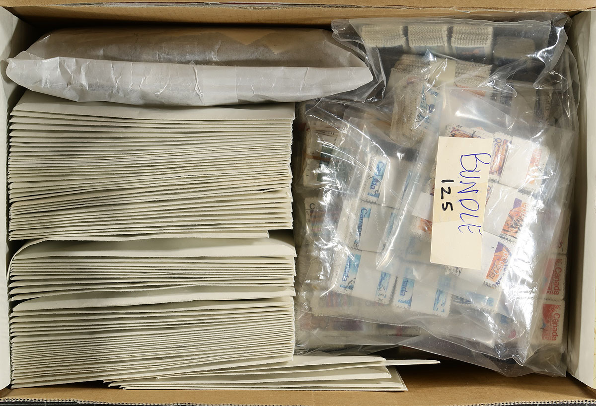 Large accumulation of used Canada, Small Queens to the 2000's. The lot contains roughly 30,000 stamps in a variety of formats including 3 stockbooks, envelopes, glassines, and bundleware. Surprisingly enough, this is a well organized accumulation with the 3 stockbooks containing material from the Small Queens to the post 2000's, noting several high value denominations, sets, earlier material, used 'P' values, souvenir sheets, etc. The lot also contains well identified envelopes, glassines and over 100 bundles of 100 stamps each, containing singles and pairs, generally from the 1950's to the 1970's. A nice lot with some better cataloguing items, and unchecked for better town cancels, overall fine to very. Estimate =