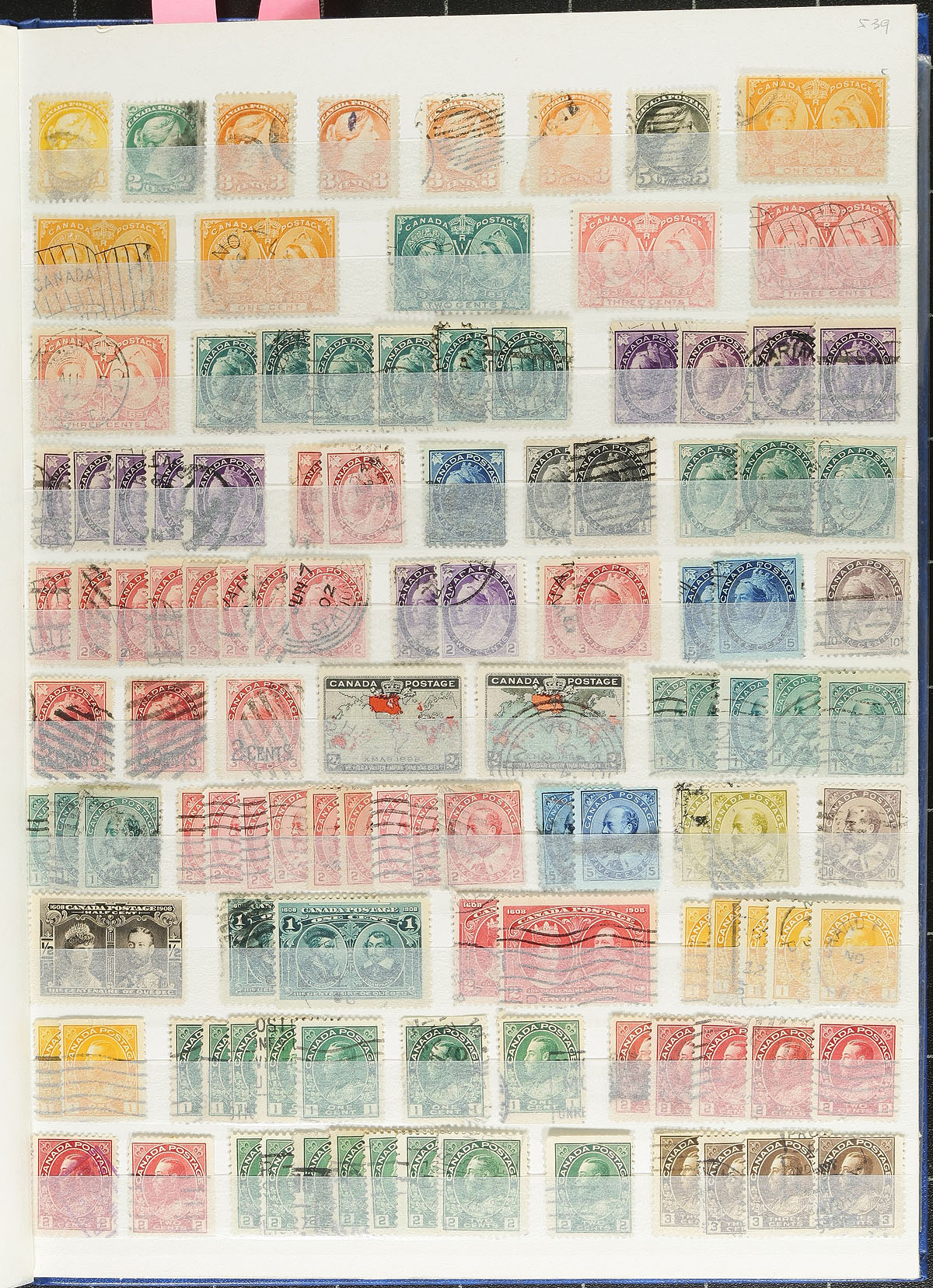 Large accumulation of used Canada, Small Queens to the 2000's. The lot contains roughly 30,000 stamps in a variety of formats including 3 stockbooks, envelopes, glassines, and bundleware. Surprisingly enough, this is a well organized accumulation with the 3 stockbooks containing material from the Small Queens to the post 2000's, noting several high value denominations, sets, earlier material, used 'P' values, souvenir sheets, etc. The lot also contains well identified envelopes, glassines and over 100 bundles of 100 stamps each, containing singles and pairs, generally from the 1950's to the 1970's. A nice lot with some better cataloguing items, and unchecked for better town cancels, overall fine to very. Estimate =