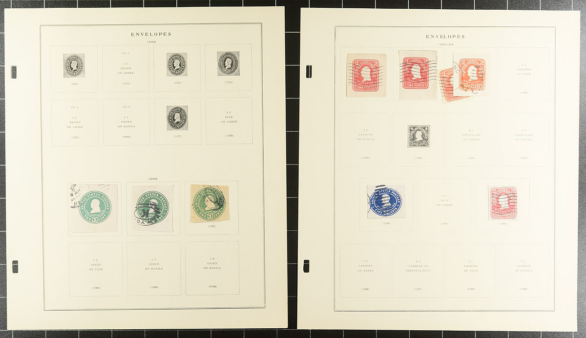 Collection of United States envelope cut squares, 1860's-1975, containing roughly 225 different items, all neatly arranged on Scott Specialty album pages. A cursory check indicated a few early items cut to shape, along with a few airmail items, and complete envelopes. A nice start to a stationery collection or to add to an existing one, a few items have been misidentified, still a nicely organized collection. Estimate =