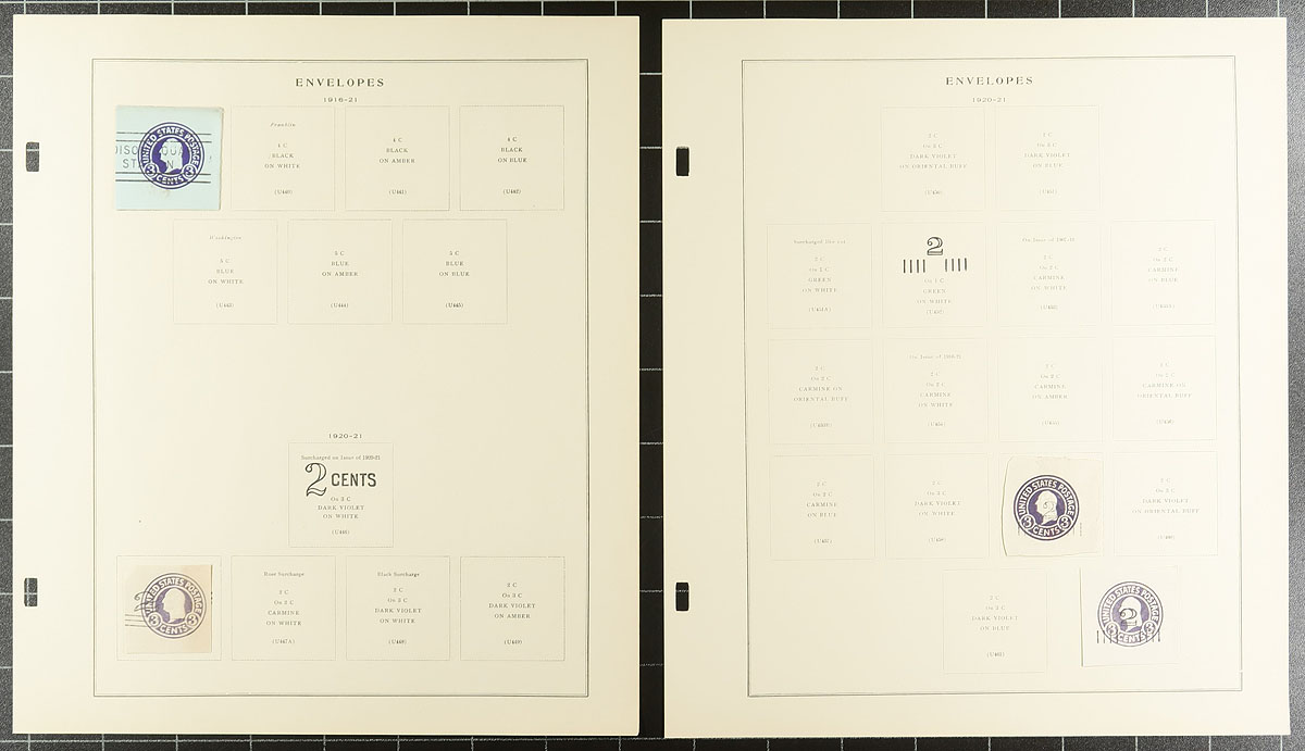 Collection of United States envelope cut squares, 1860's-1975, containing roughly 225 different items, all neatly arranged on Scott Specialty album pages. A cursory check indicated a few early items cut to shape, along with a few airmail items, and complete envelopes. A nice start to a stationery collection or to add to an existing one, a few items have been misidentified, still a nicely organized collection. Estimate =