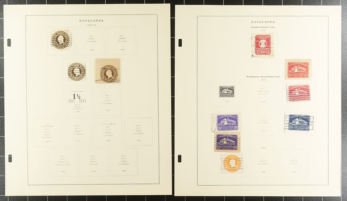 Collection of United States envelope cut squares, 1860's-1975, containing roughly 225 different items, all neatly arranged on Scott Specialty album pages. A cursory check indicated a few early items cut to shape, along with a few airmail items, and complete envelopes. A nice start to a stationery collection or to add to an existing one, a few items have been misidentified, still a nicely organized collection. Estimate =