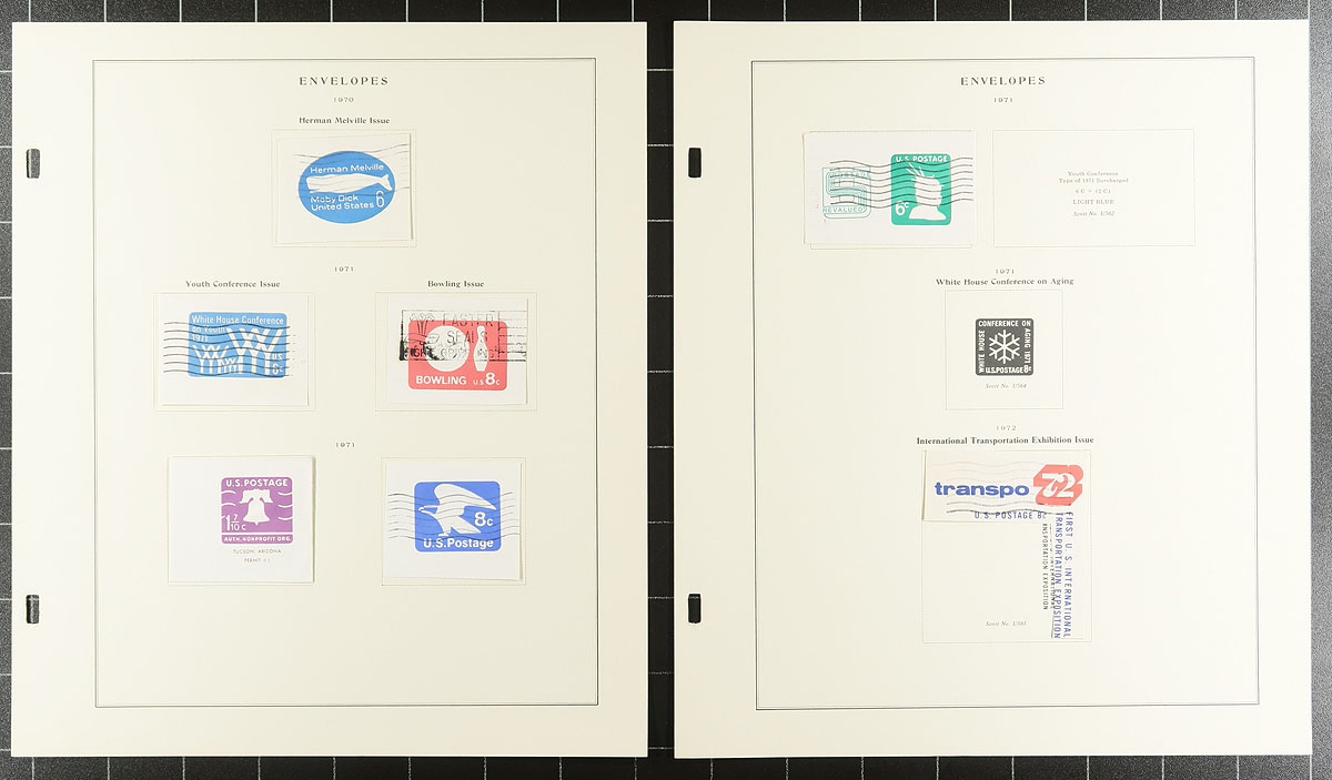Collection of United States envelope cut squares, 1860's-1975, containing roughly 225 different items, all neatly arranged on Scott Specialty album pages. A cursory check indicated a few early items cut to shape, along with a few airmail items, and complete envelopes. A nice start to a stationery collection or to add to an existing one, a few items have been misidentified, still a nicely organized collection. Estimate =