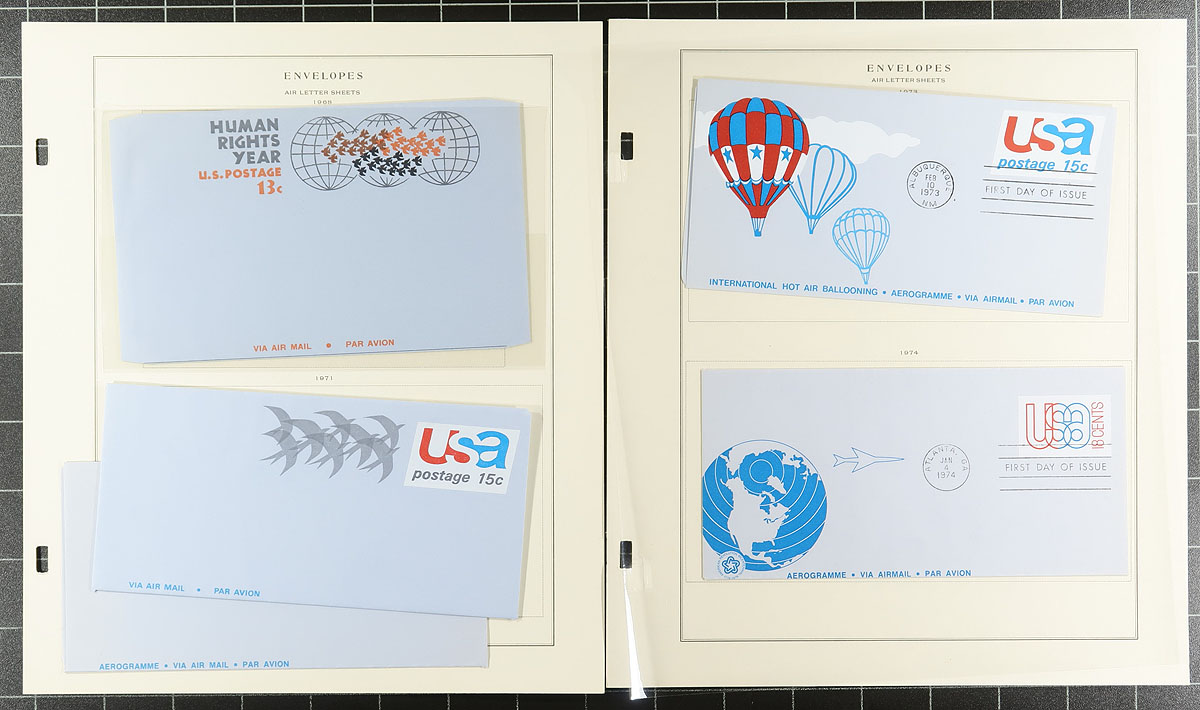 Collection of United States envelope cut squares, 1860's-1975, containing roughly 225 different items, all neatly arranged on Scott Specialty album pages. A cursory check indicated a few early items cut to shape, along with a few airmail items, and complete envelopes. A nice start to a stationery collection or to add to an existing one, a few items have been misidentified, still a nicely organized collection. Estimate =