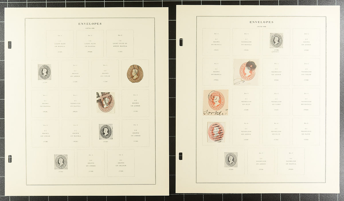 Collection of United States envelope cut squares, 1860's-1975, containing roughly 225 different items, all neatly arranged on Scott Specialty album pages. A cursory check indicated a few early items cut to shape, along with a few airmail items, and complete envelopes. A nice start to a stationery collection or to add to an existing one, a few items have been misidentified, still a nicely organized collection. Estimate =