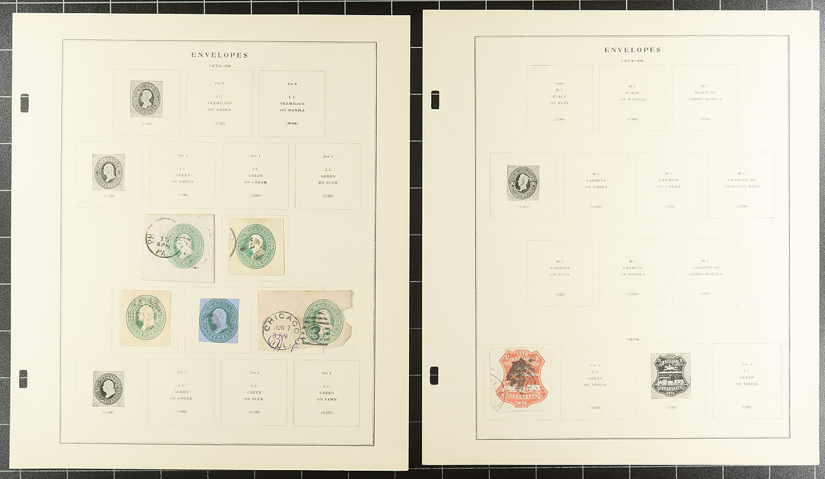 Collection of United States envelope cut squares, 1860's-1975, containing roughly 225 different items, all neatly arranged on Scott Specialty album pages. A cursory check indicated a few early items cut to shape, along with a few airmail items, and complete envelopes. A nice start to a stationery collection or to add to an existing one, a few items have been misidentified, still a nicely organized collection. Estimate =