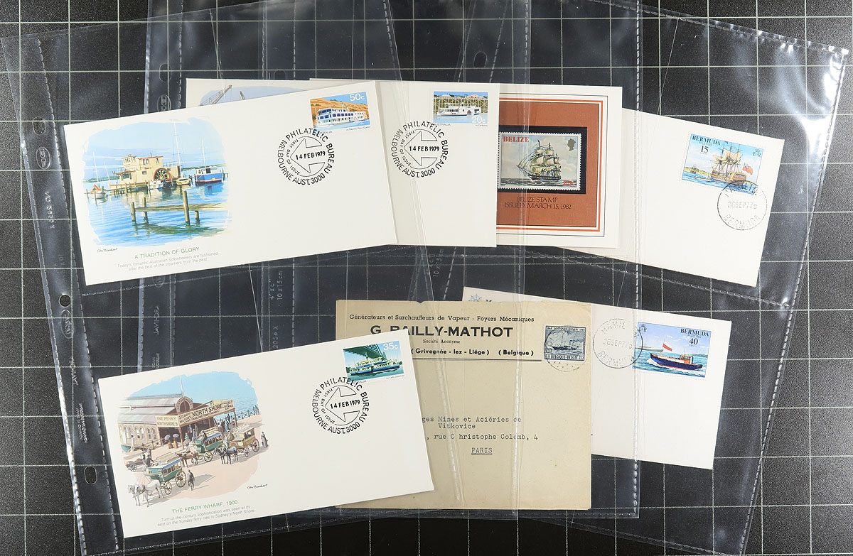 Nice collection of boats and ships on cover, containing over 200 covers housed in 2 binders. We encountered mostly commemorative or first day covers, along with a few postcards and maximum cards, with better representation from Canada and France, including French Colonies. Most of the material appears to range from the 1950's to the 1990's, with a few beyond the given range. A nice collection from this popular collecting topic. Estimate =