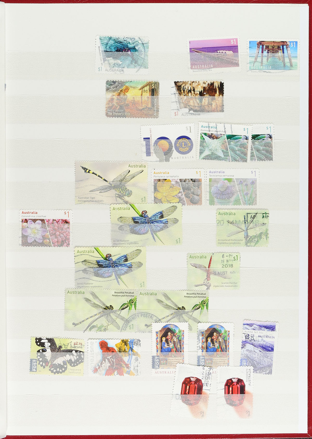 Consignment remainders of used Australia, 1913-2019, containing a few thousand stamps in a few formats including many manila stock pages, homemade pages, and a few stockbooks. A cursory check indicated a nice selection of over 50 Kangaroos, including Scott #54 (x3, c.v. $300 total), along with over 100 KGV Heads (including various shade types), and continues with a typical accumulation of stamps with strength from the 1950s to the 1980s. The lot also includes two annual collections from 2018-2019. A nice lot with for the Australia collector, overall fine to very fine. Estimate =
