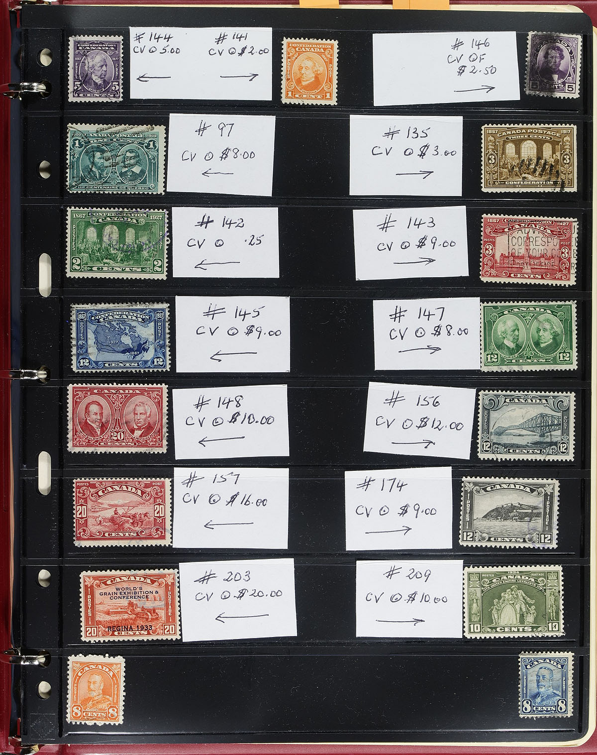 Consignment remainders of used Canada, Small Queens to 2000's, containing a few thousand stamps in 3 stockbooks, an album, and several manila stock pages. A cursory check indicated roughly 100 Small Queens (owner indicated a few shades, perforations, etc), along singles, sets, and partial sets from 1900 to roughly the 1950's, and continues with further accumulations of issues post 1980, including several 'P' value stamps. An interesting lot with some issues cataloguing $10 and up. Overall fine to very fine. Estimate =