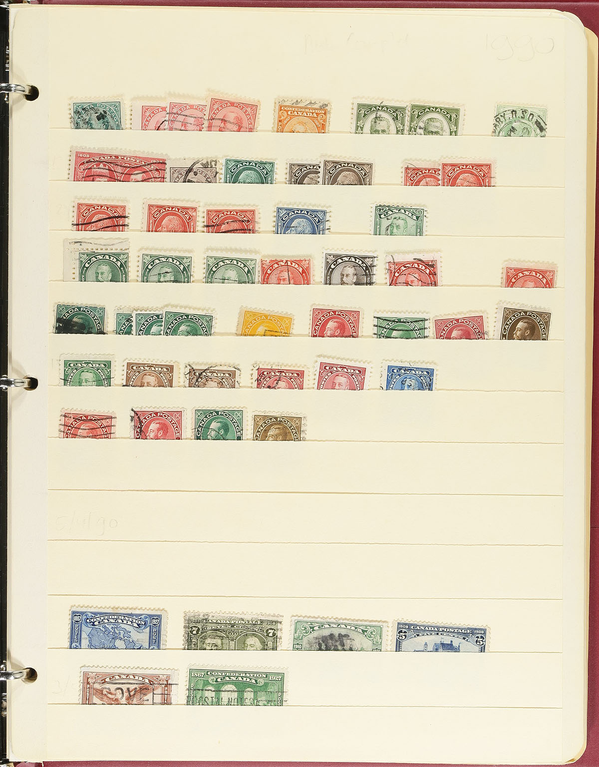 Consignment remainders of used Canada, Small Queens to 2000's, containing a few thousand stamps in 3 stockbooks, an album, and several manila stock pages. A cursory check indicated roughly 100 Small Queens (owner indicated a few shades, perforations, etc), along singles, sets, and partial sets from 1900 to roughly the 1950's, and continues with further accumulations of issues post 1980, including several 'P' value stamps. An interesting lot with some issues cataloguing $10 and up. Overall fine to very fine. Estimate =