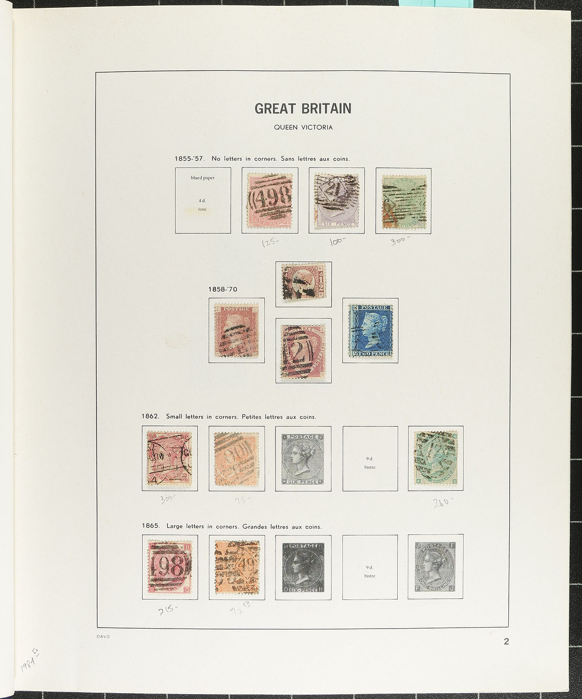 Nice collection of used Great Britain, 1840-2002, containing roughly 1,700 stamps in a DAVO album. This neatly organized collection ranges from Scott #1/2135, containing singles, sets, and partial sets, beginning with roughly 50 different Victorian issues noting better with #s 1 Penny Black (position MG, 2 margins, c.v. $375), 3-4, 26-28, 42, 44, 59, 73, 100-107, along with partial sets of Edwards, KGV and KGVI, including a few Seahorses. Owner's 2026 Scott catalogue value totals US$9,332.00 (counting up to 1961 only), noting a few stamps cataloguing $20 and up. A nice start to a classic Great Britain collection. A few faults expected with a few of the early issues, overall fine to very fine. 2026 Scott US$9,332.00 =