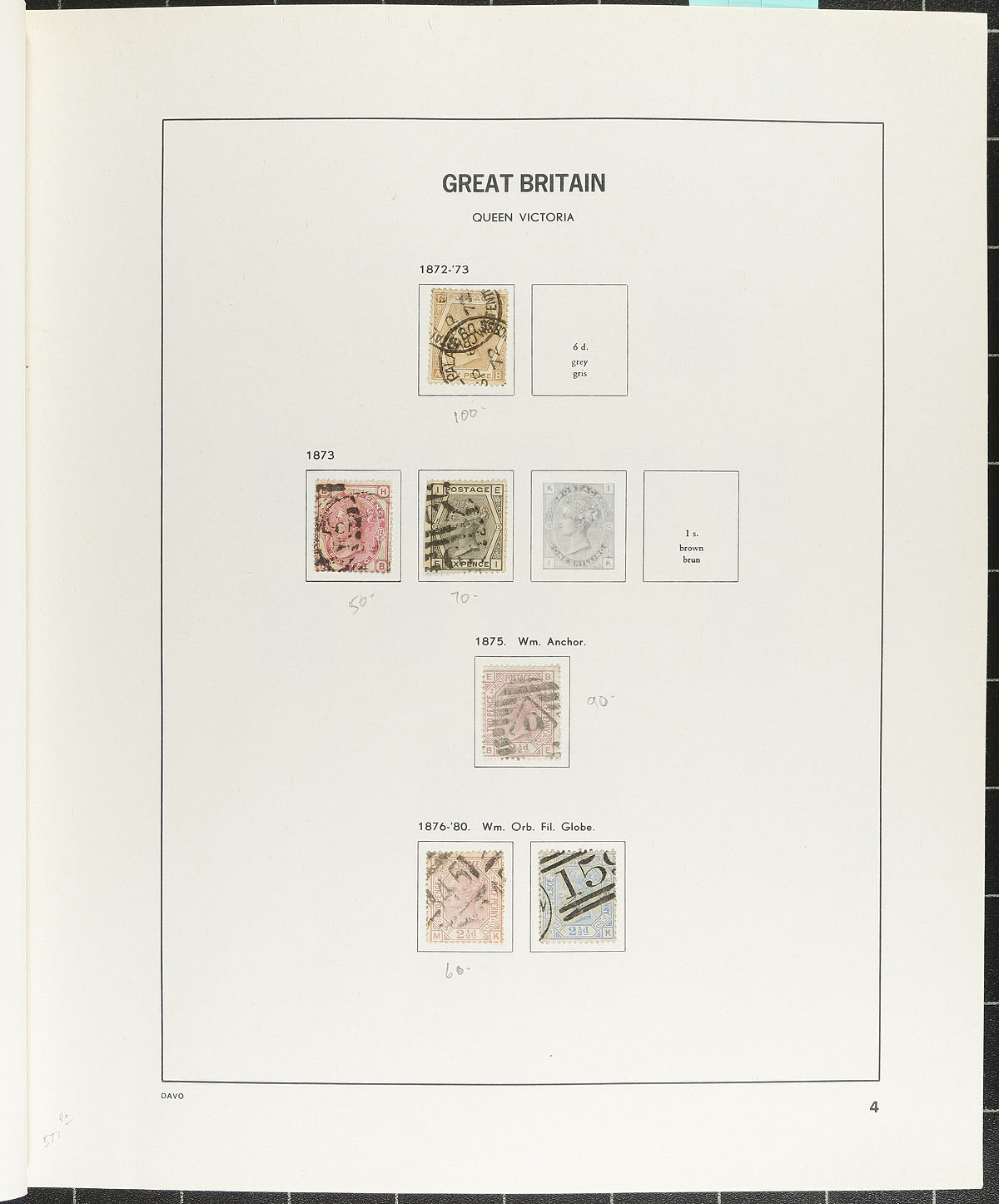 Nice collection of used Great Britain, 1840-2002, containing roughly 1,700 stamps in a DAVO album. This neatly organized collection ranges from Scott #1/2135, containing singles, sets, and partial sets, beginning with roughly 50 different Victorian issues noting better with #s 1 Penny Black (position MG, 2 margins, c.v. $375), 3-4, 26-28, 42, 44, 59, 73, 100-107, along with partial sets of Edwards, KGV and KGVI, including a few Seahorses. Owner's 2026 Scott catalogue value totals US$9,332.00 (counting up to 1961 only), noting a few stamps cataloguing $20 and up. A nice start to a classic Great Britain collection. A few faults expected with a few of the early issues, overall fine to very fine. 2026 Scott US$9,332.00 =