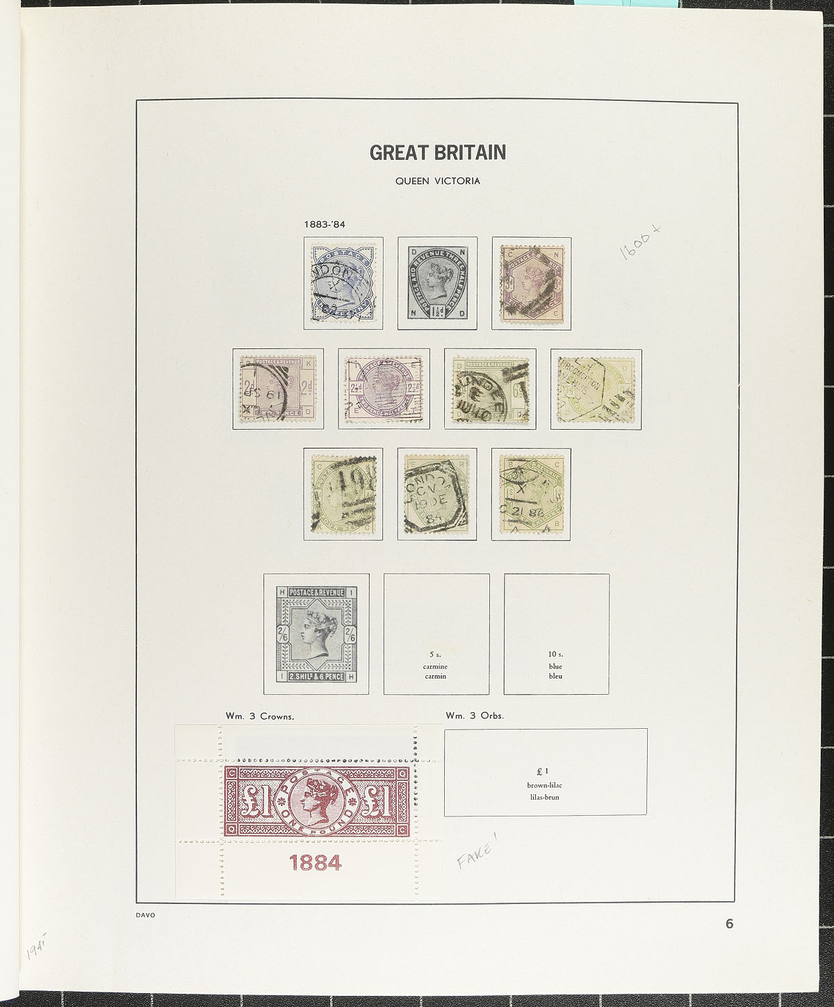 Nice collection of used Great Britain, 1840-2002, containing roughly 1,700 stamps in a DAVO album. This neatly organized collection ranges from Scott #1/2135, containing singles, sets, and partial sets, beginning with roughly 50 different Victorian issues noting better with #s 1 Penny Black (position MG, 2 margins, c.v. $375), 3-4, 26-28, 42, 44, 59, 73, 100-107, along with partial sets of Edwards, KGV and KGVI, including a few Seahorses. Owner's 2026 Scott catalogue value totals US$9,332.00 (counting up to 1961 only), noting a few stamps cataloguing $20 and up. A nice start to a classic Great Britain collection. A few faults expected with a few of the early issues, overall fine to very fine. 2026 Scott US$9,332.00 =