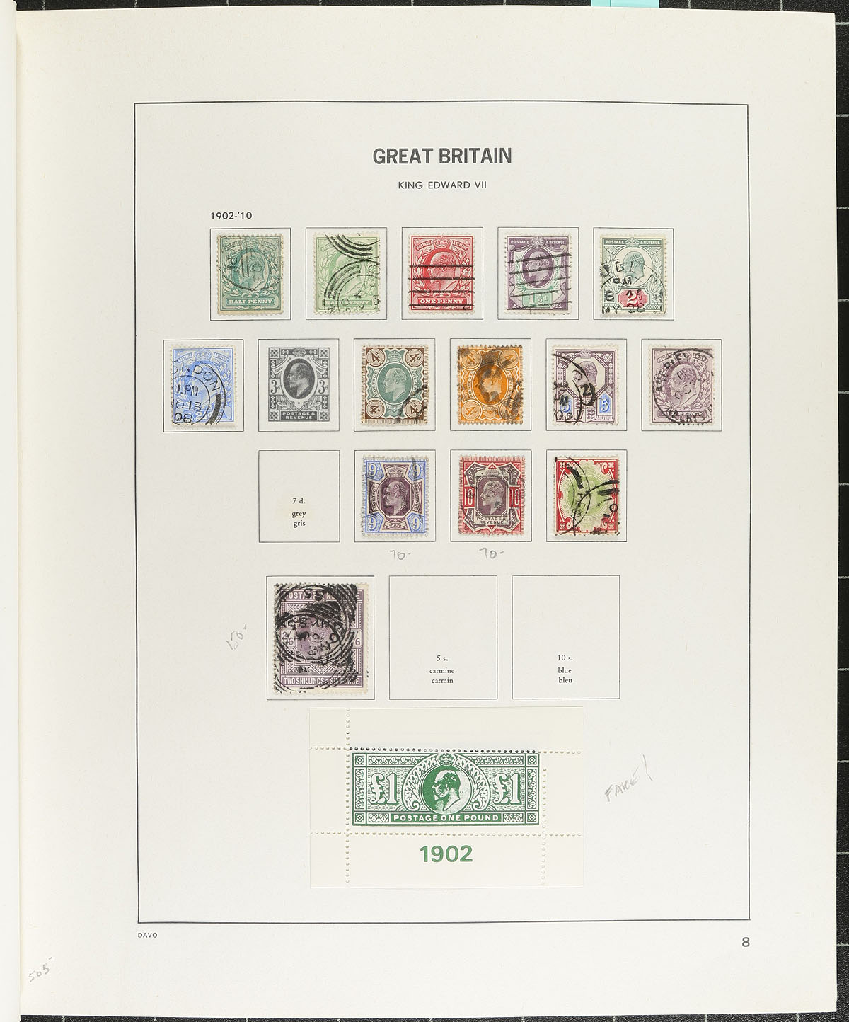 Nice collection of used Great Britain, 1840-2002, containing roughly 1,700 stamps in a DAVO album. This neatly organized collection ranges from Scott #1/2135, containing singles, sets, and partial sets, beginning with roughly 50 different Victorian issues noting better with #s 1 Penny Black (position MG, 2 margins, c.v. $375), 3-4, 26-28, 42, 44, 59, 73, 100-107, along with partial sets of Edwards, KGV and KGVI, including a few Seahorses. Owner's 2026 Scott catalogue value totals US$9,332.00 (counting up to 1961 only), noting a few stamps cataloguing $20 and up. A nice start to a classic Great Britain collection. A few faults expected with a few of the early issues, overall fine to very fine. 2026 Scott US$9,332.00 =